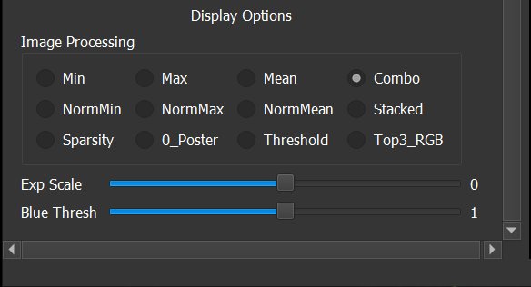 The next group of choices we’ll describe are the Min, Max, and Mean options on the top row of the Image Processing choices. As you might guess from the brief help text, these options work similarly to their “Norm” counterparts. The difference is that instead of normalizing the displayed ranges based on mean and standard deviation, the Min, Max, and Mean options always scale the Summary View to show black at the overall min value, white at the overall max value, and gray in between. In particular, this means that at least one pixel will be true black in the Min view, and at least one pixel will be pure white in the Max view. But because the minimum and maximum values may be outliers present on just one channel slice, these views tend to appear more “muted” (i.e., more dominantly gray) than their “Norm” counterparts.
