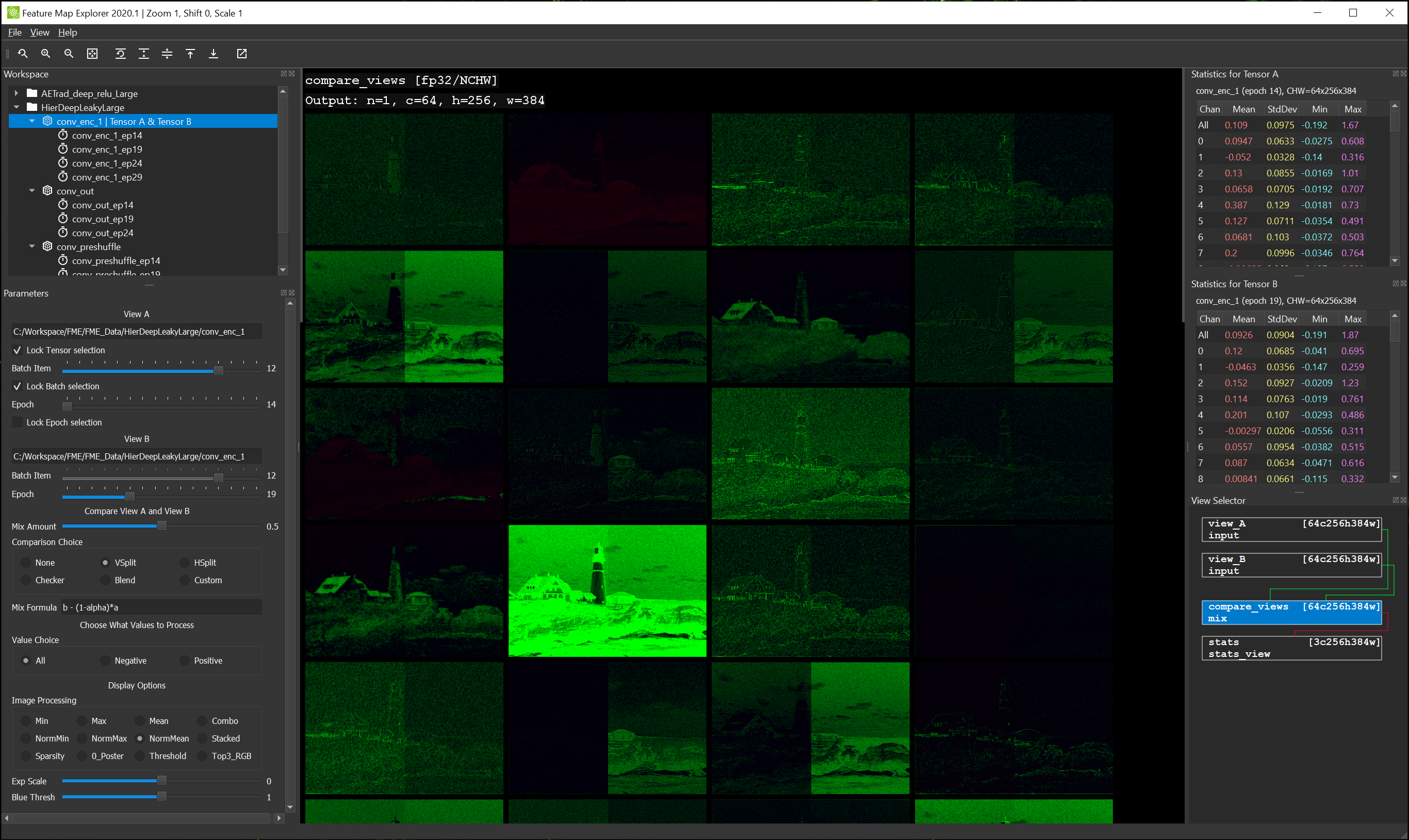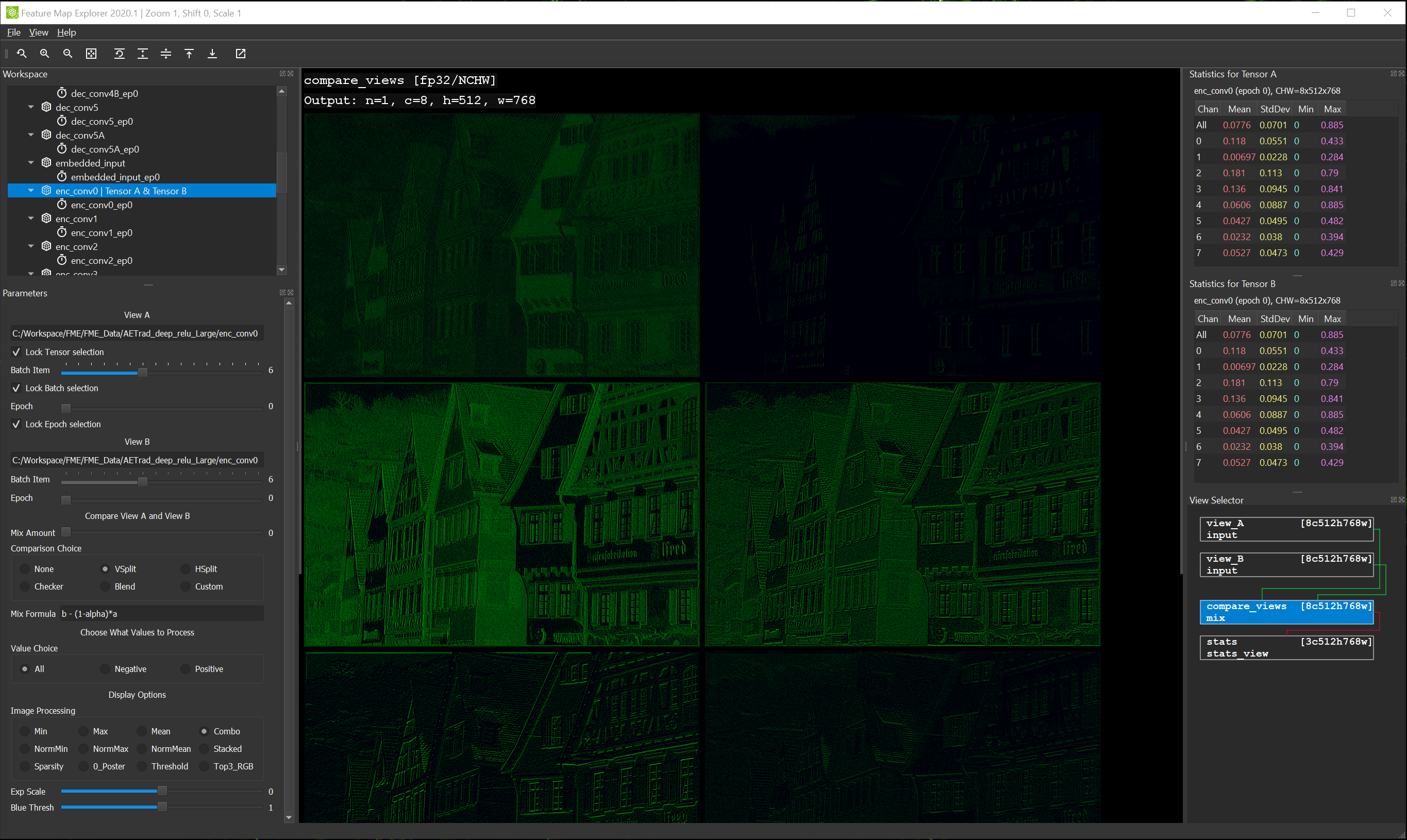 However, there is a big downside to the way FME presents this information when using the Image Processing options popular in the Getting Started section: Recall that these options were designed to “draw out” the features present in a feature map with large channel count, by scaling even small differences to broader monochrome or color ranges? Well, this processing still takes place even when you are viewing differences – so small differences become more exaggerated the closer View A is to View B. There are circumstances when this could provide some insight, but generally speaking, it is not very satisfying to expect to mainly see convergence but instead see overly-emphasized differences.