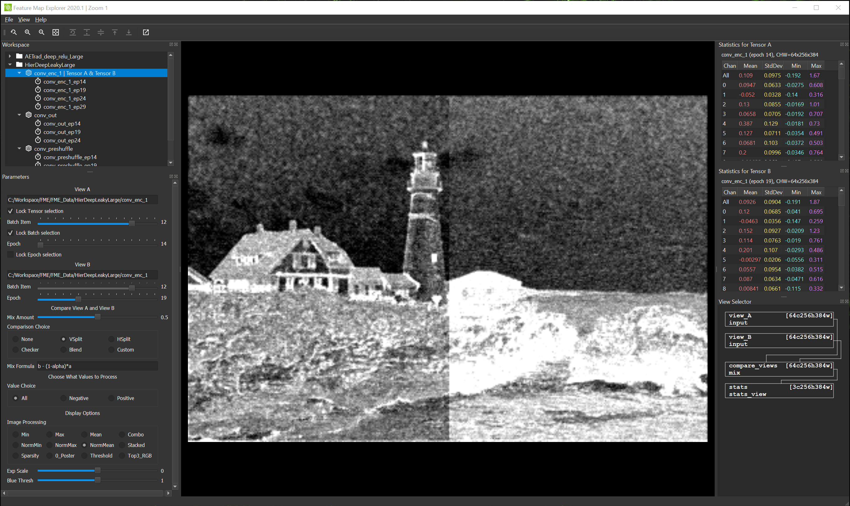 Terminology: FME actually allows you to select two separate tensors (marked as Tensor A and Tensor B in the Workspace panel) at once, and visualize them from two different views: View A and View B (defined under the View A and View B sections of the Parameter panel, and switchable from the View Selector panel) respectively. By default, these two tensor choices are locked to the same selection (via the Lock Tensor selection checkbox in the View A section of the Parameters panel), but you can still having two different views by varying the Batch Item slider or the Epoch slider (the Lock Batch selection and Lock Epoch selection checkboxes in the View A section of the Parameters panel need to be unchecked). See the following screenshot for an example of selecting tensor conv_enc_1 from epoch 14 for view A and the same tensor from epoch 19 for view B.