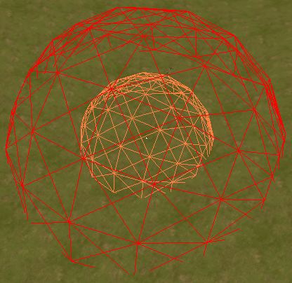An explosion actors preview rendering can also include a the inner and outer spheres that control the size of the explosion. The outer sphere is rendered in red and the inner sphere is orange.