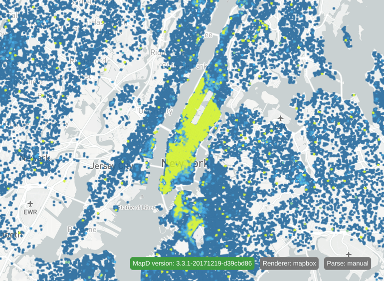 Density accumulation performs a count aggregation by pixel. It allows you to color a pixel by normalizing the count and applying a color to it, based on a color scale. In Heavy Immerse, if you open or create a Pointmap chart, you can toggle density accumulation on and off by using the Density Gradient attribute. For more information, see Pointmap.