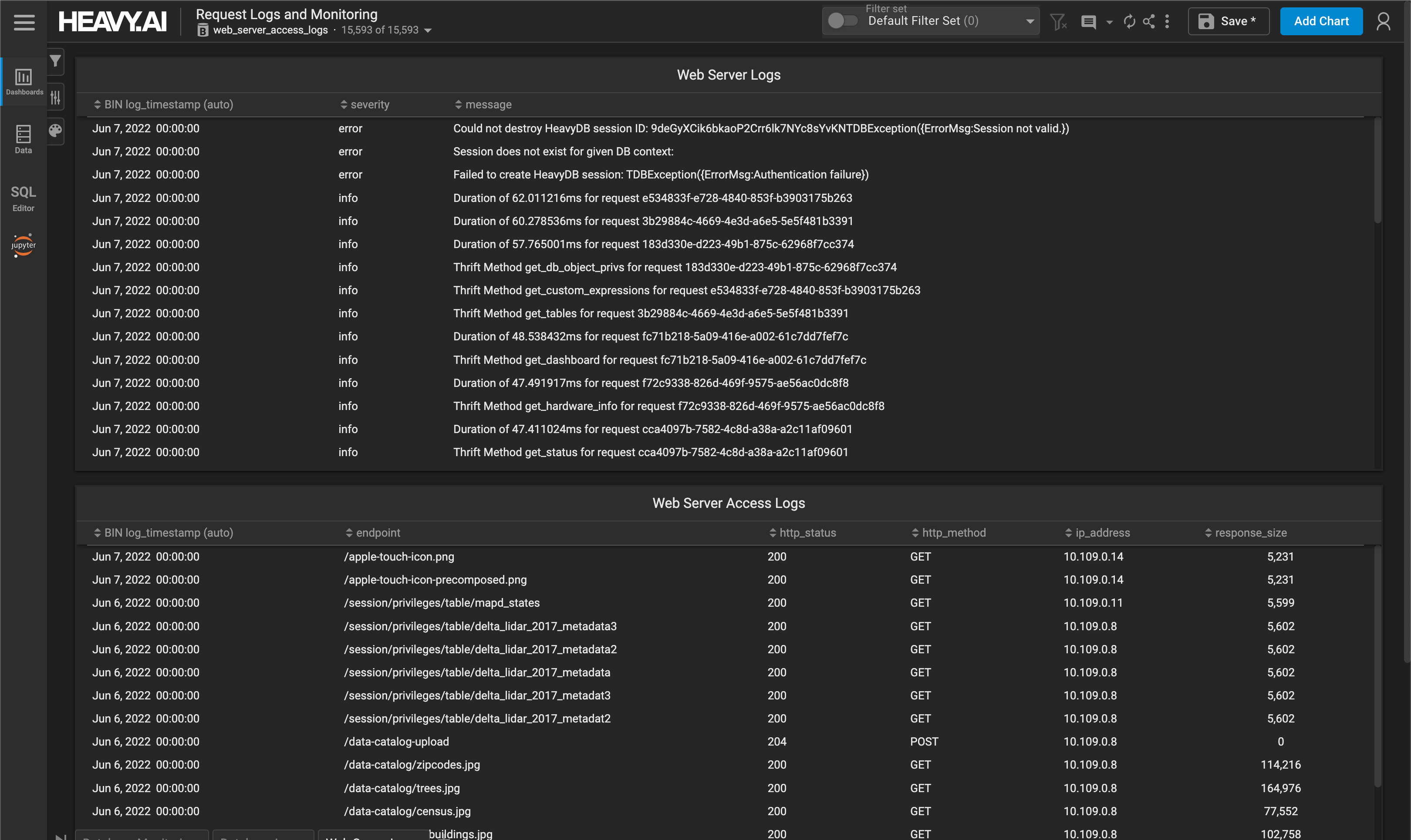 * Web Server Access Logs - Sortable by log timestamp, endpoint, HTTP status, HTTP method, IP address, and response size.