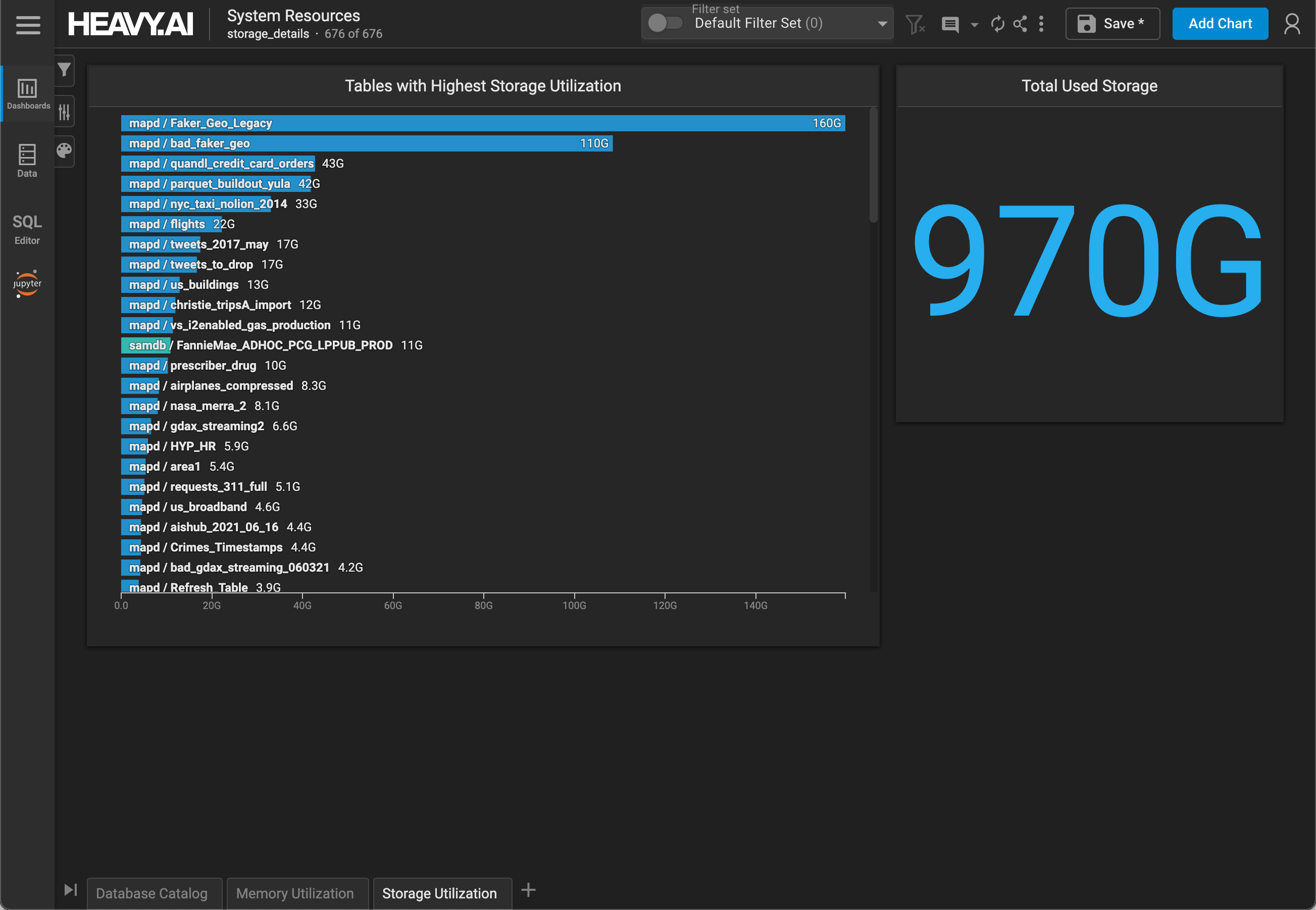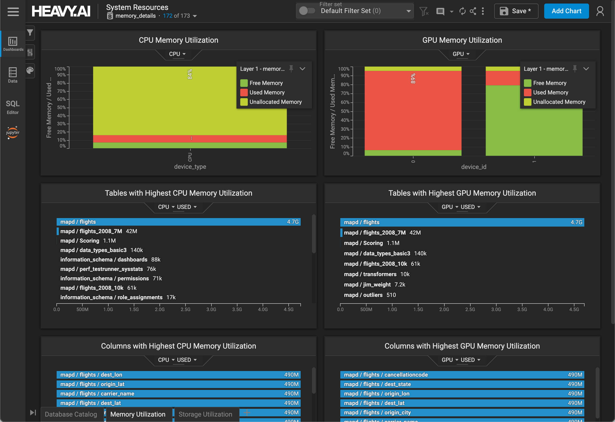The Admin Portal is a collection of dashboards available in the included `information_schema` database in Heavy Immerse. The dashboards display point-in-time information of the HEAVY.AI platform resources and users of the system.