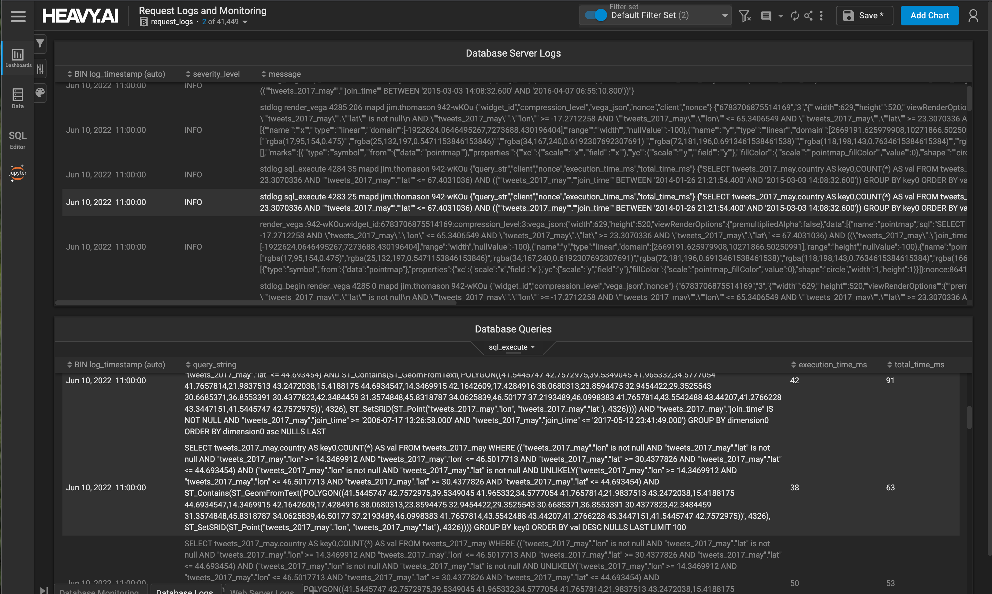 * Database Server Logs - Sortable by log timestamp, severity level, message, file location, process ID, query ID, thread ID, and node.