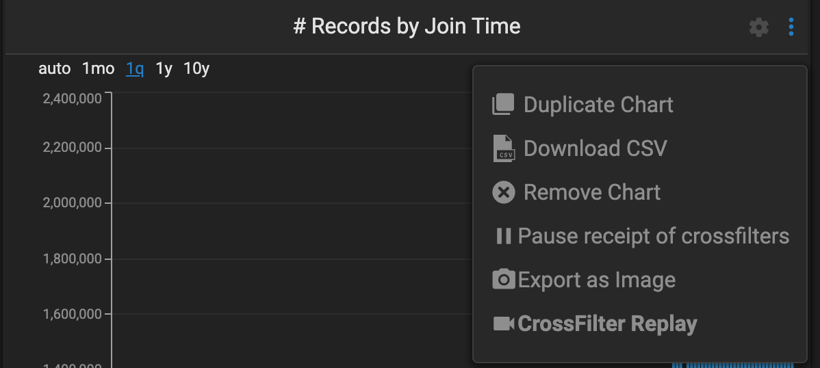 Crossfilter replay controls added below the chart are visible when you mouse over the chart.