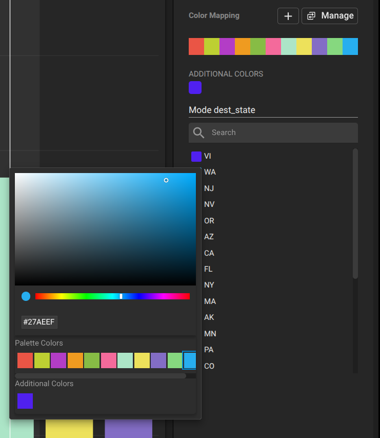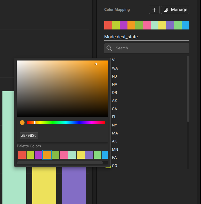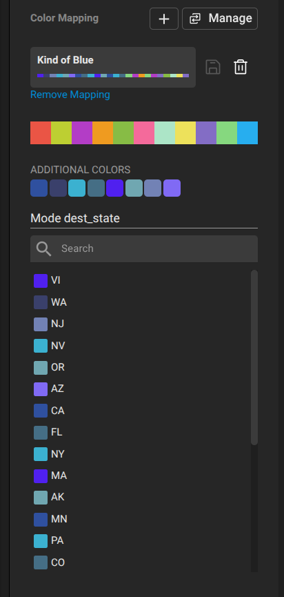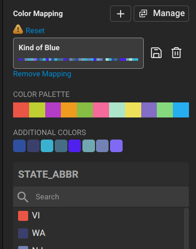 This is the Color Mapping Manager, which allows us to select which Color Mapping we want to assign to our current chart. Notice that at the top, we get a message saying we don’t have any mappings that match our current data source and column - remember, we used two different sources for the Combo and Choropleth. When assigning mappings created from different data sources and columns, there is no guarantee that the values the colors are assigned to will match up with the values in your current column; for all the values that do not match, the colors will simply be auto-hashed based on your current palette. However, since we know these two columns contain state abbreviations and will in fact match, we are safe to use our “Kind of Blue” mapping created previously. Simply click on that mapping to assign it to the current chart.