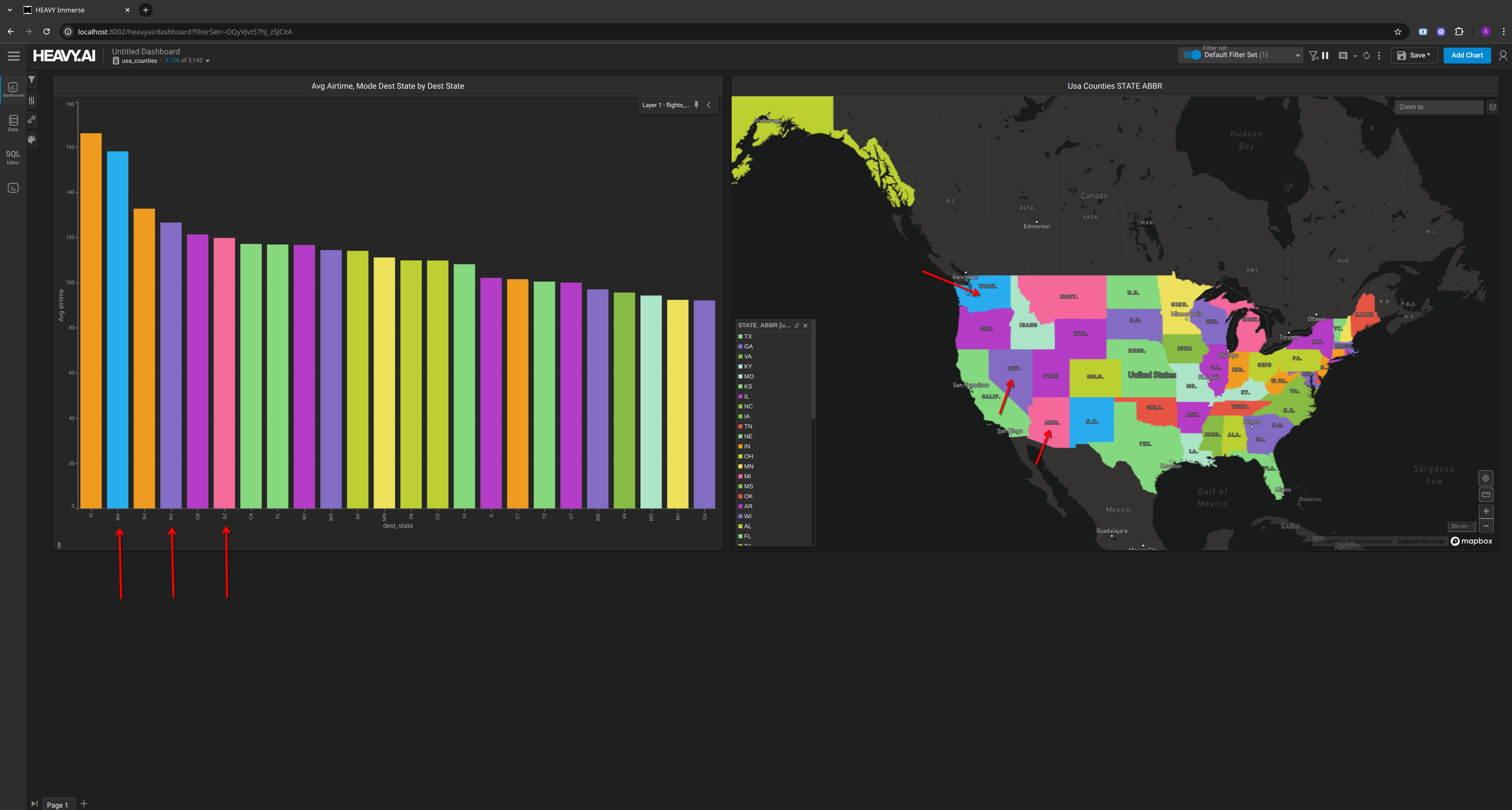It’s important to note that these charts use two completely different data sources. The Combo chart uses a flights dataset, colored by destination state abbreviation, while the Choropleth uses a dataset on US counties, colored by state abbreviation. Despite the different data sources, the coloring remains consistent across both charts. In the screenshot above, we highlighted three states on the Combo chart: Washington (in blue), Nevada (in dark purple), and Arizona (in pink). You’ll see these states have matching colors on the Choropleth.