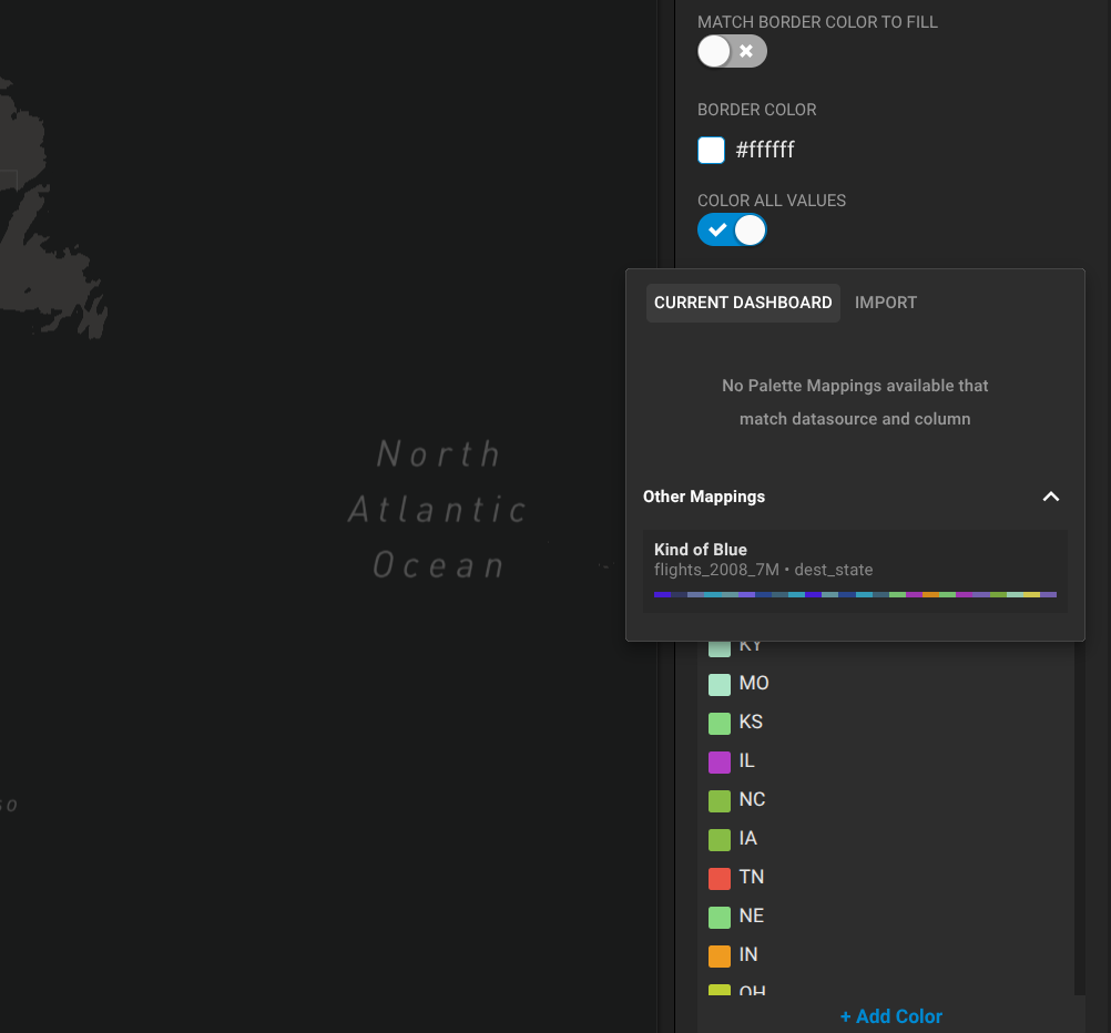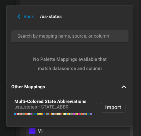 One note - mappings imported across dashboards do not retain links to their original source. This means, if we import the “Multi-Colored State Abbreviations” mapping into our own dashboard and make changes, saved changes will not affect the original mapping. Each mapping is local to its dashboard, so you are free to import mappings and make changes without worrying about effecting other dashboards.