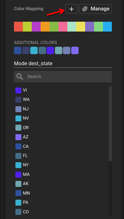 Now let’s explore how we can carry over custom color modifications between charts. To illustrate this, in the example below we have re-assigned the colors for numerous values to different shades of blue. To save these customizations, we need to create a new Color Mapping. To do this, click the plus button, as shown below: