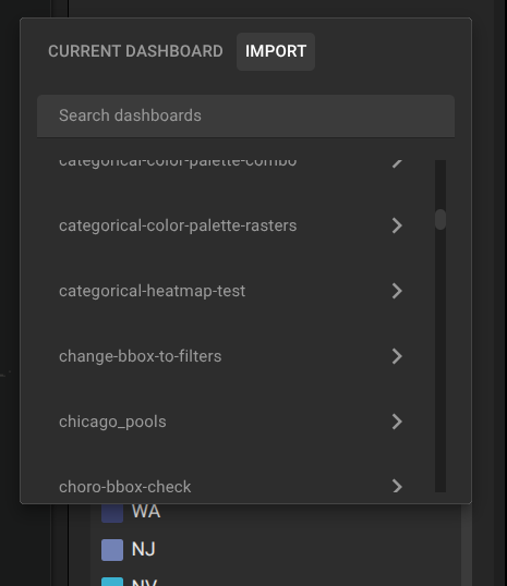 Color Mappings can also be imported from other dashboards, saving you from having to re-create mappings on each dashboard. To import a Color Mapping, click the “Manage” button, and click on the “Import” button in the Color Mapping Manager: