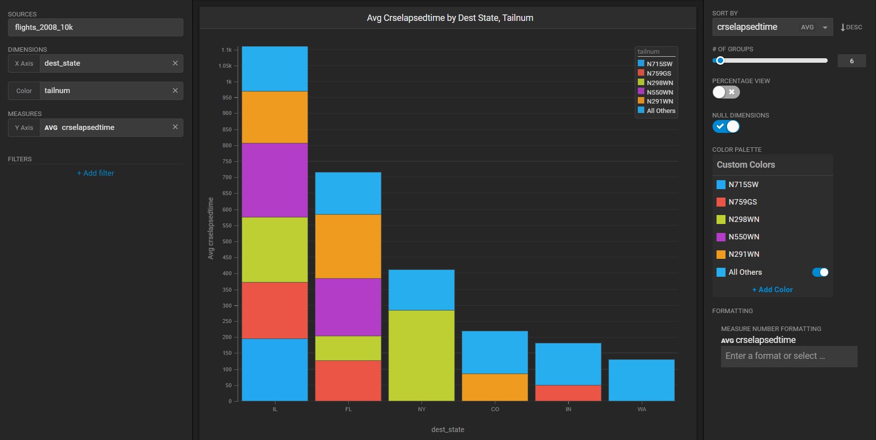 In some cases, if you disable All Others from the color menu, the # of Groups does not match what is shown on the x axis. For example, in the following chart, the number of X axis items for dest_state is five, but the # of Groups is set to 6.