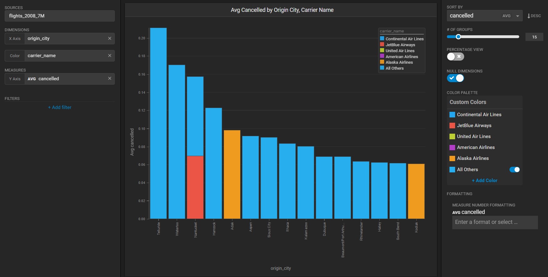 You can reduce the number of cities on the X Axis by sliding the # of Groups down (15 in the next example), and show the value for all other airlines by toggling All Others to On in the Color Palette: