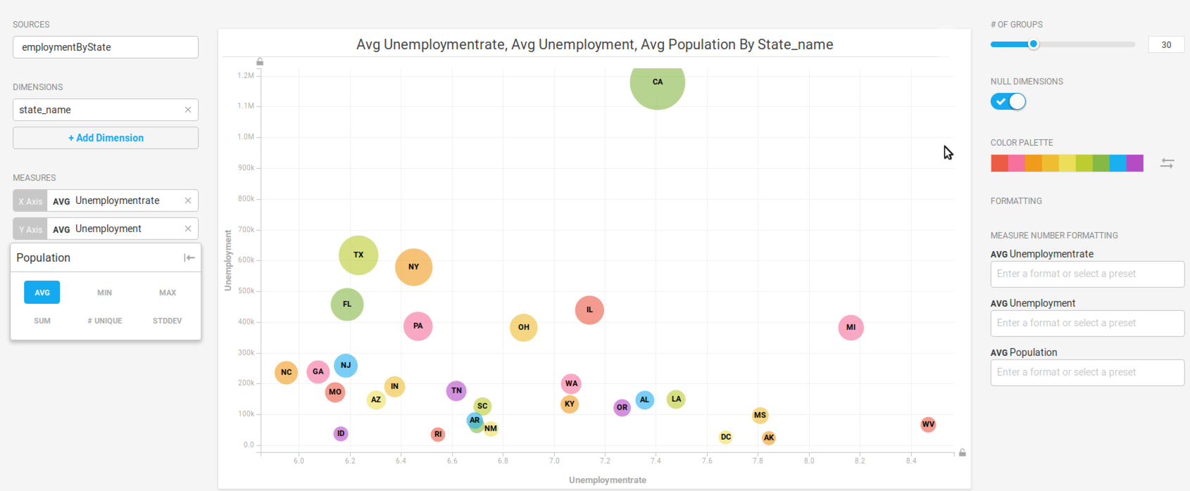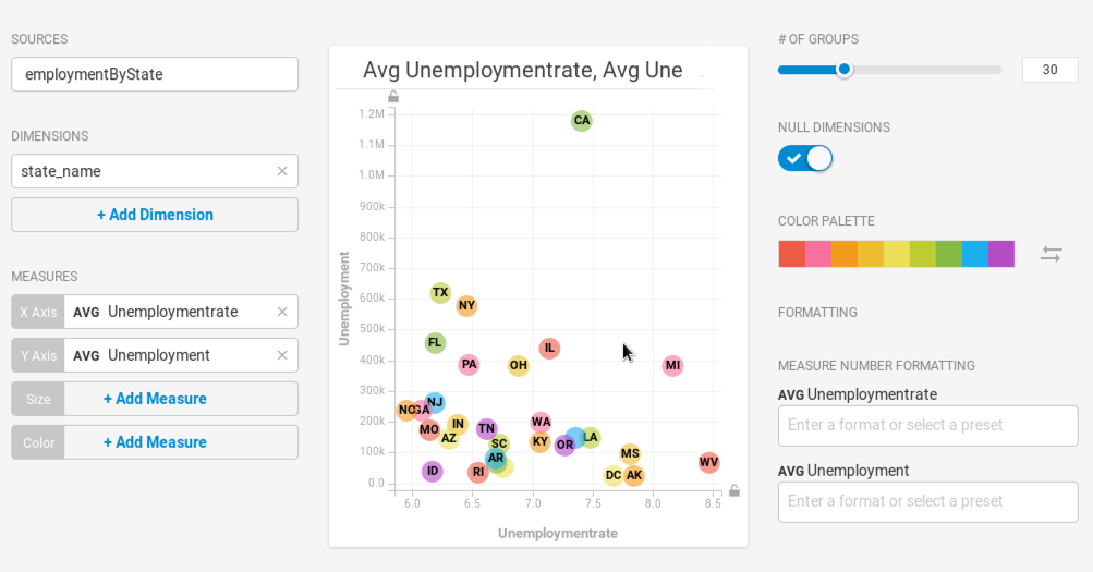State_name is a handy dimension for this data. Use the average Unemployment_rate as the X Axis, and the average Unemployment total for the Y Axis. Increase the # of Groups to 50 to create an individual bubble for each state.