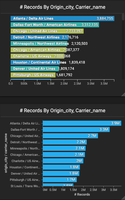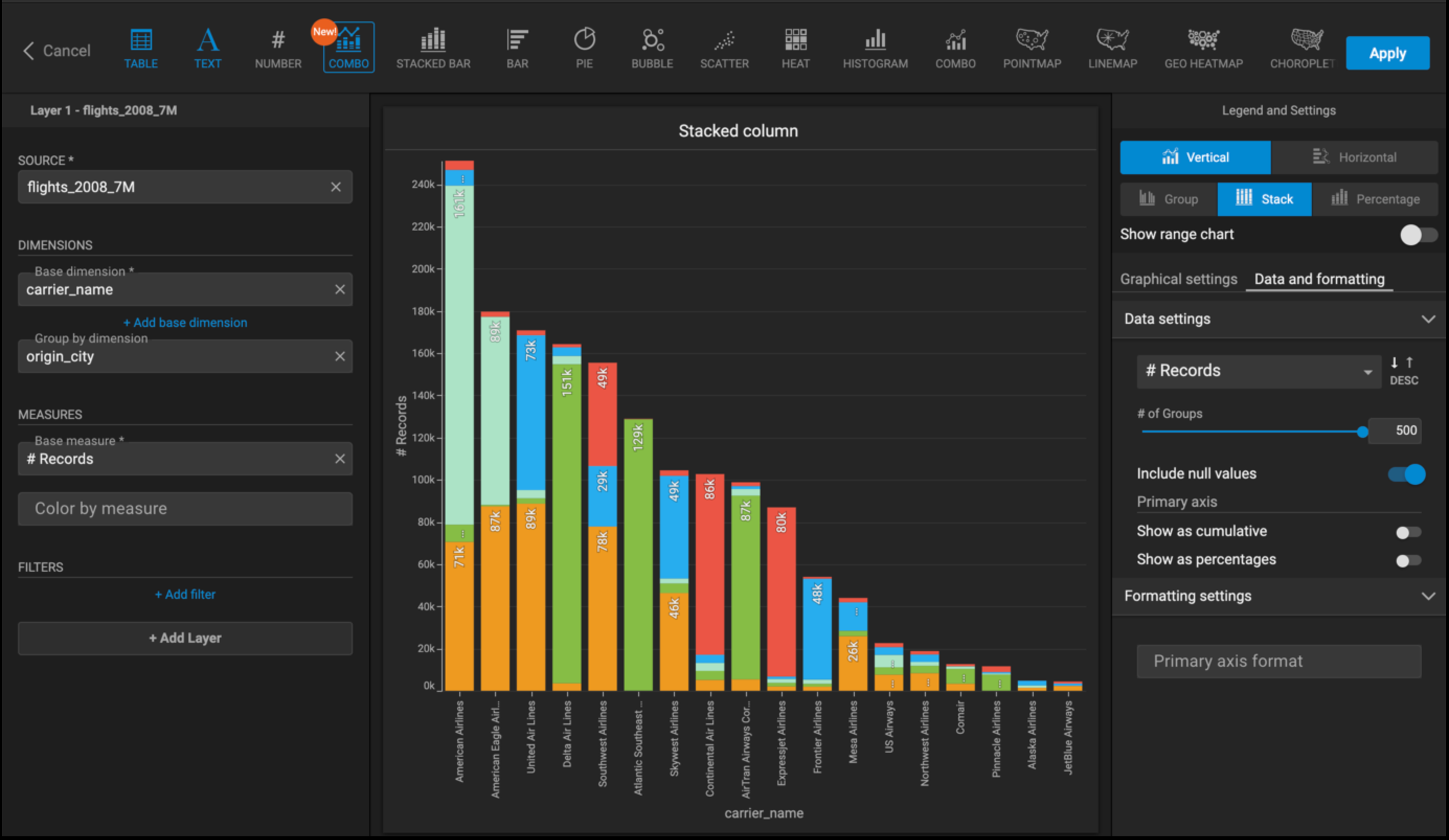 Let’s add the carrier_name dimension, change the orientation to Horizontal, and select Stack to create a stacked bar chart.
