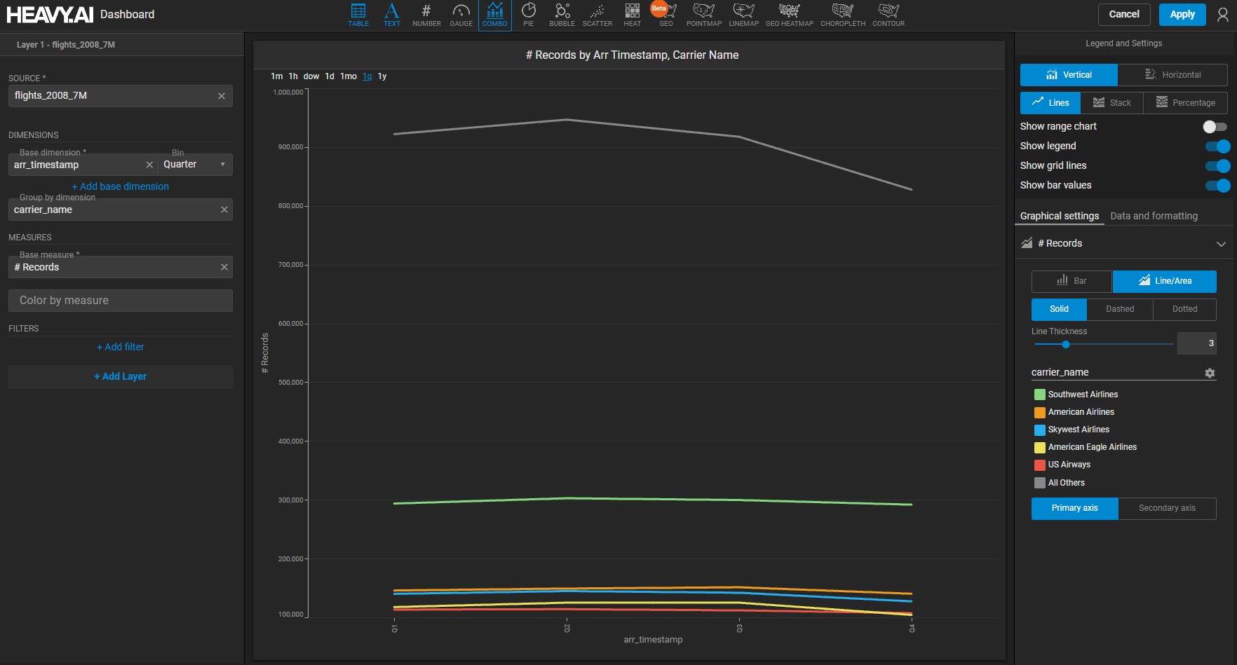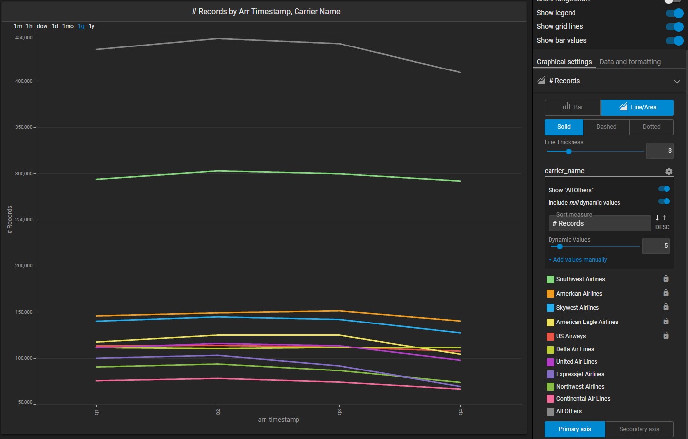 Say you want to customize the number of carriers displayed. In addition to the dynamic values that already appear, you can manually select other airlines to appear in the chart.