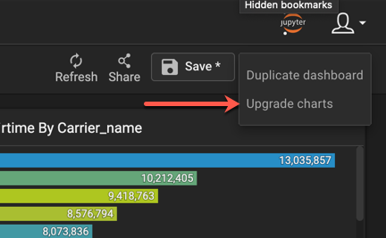 You can also convert all upgradable charts on a dashboard at once by clicking the More option menu on the dashboard and then clicking Upgrade charts.