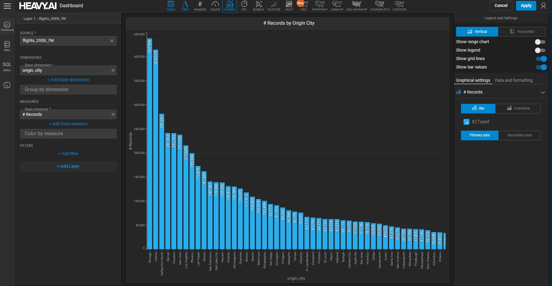 Create a chart using the flights data source, with the following: