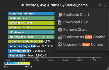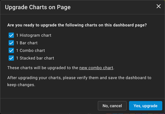 You can copy or upgrade compatible chart types (Combo, Bar, Histogram, and Stacked Bar) as New Combo charts at the Dashboard level. Copying a chart preserves the original chart and makes a duplicate New Combo chart; upgrading converts that chart to a New Combo chart.