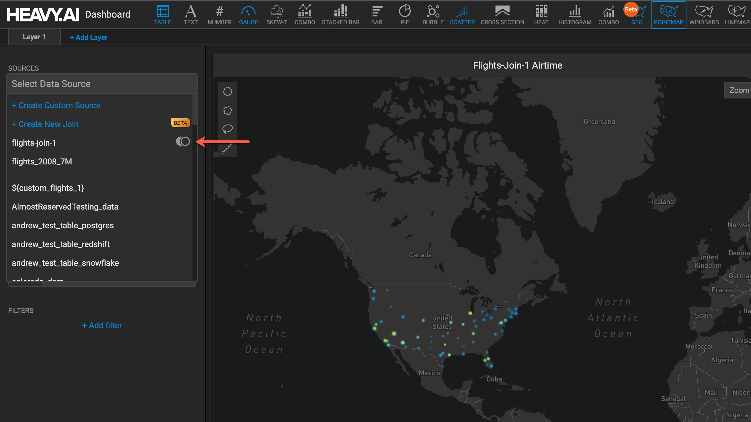 - You can use the join you just created as the source for other charts; the join icon denotes a join source. Here, the Pointmap is created using the flights-join-1 source, with Lon, Lat, and Size measures defined as shown: