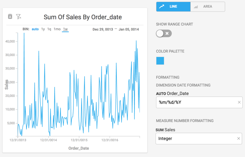 2) For every numerical measure or date dimension selected for the chart, a formatting input box is added to the right-hand configuration panel. For example, the chart below shows one numerical measure (SUM Sales) and one date dimension (AUTO Order_Date):
