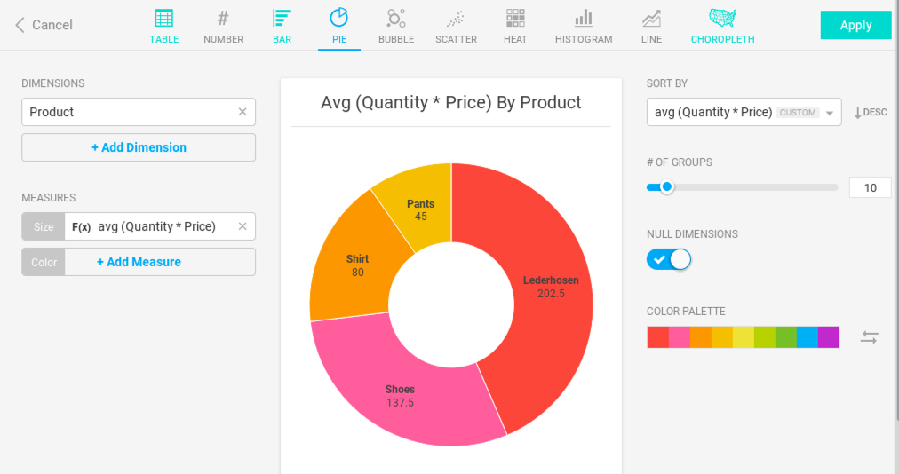 Depending on the chart, Immerse can visualize anywhere from one to four measures. A Pie chart, for example, offers 2 measures, Size and Color. Whichever column you choose as the size measure is used to determine the size of the slices in the pie chart. Color is an optional second measure for Pie Chart, allowing another layer of information to be visualized on the same chart. For example, you can size the Pie’s slices by the number of sales opportunities that are closed, and color them by the average income from those sales.