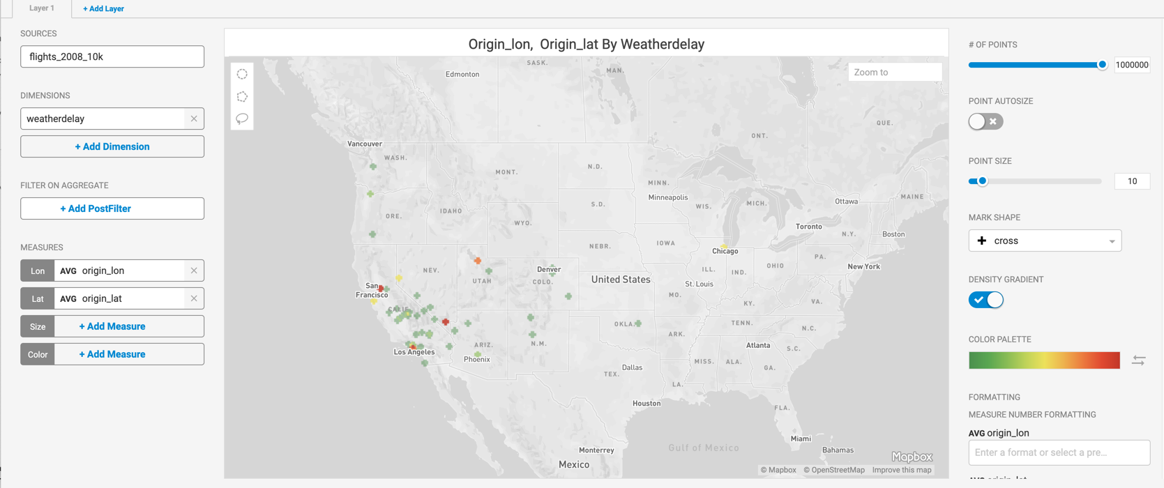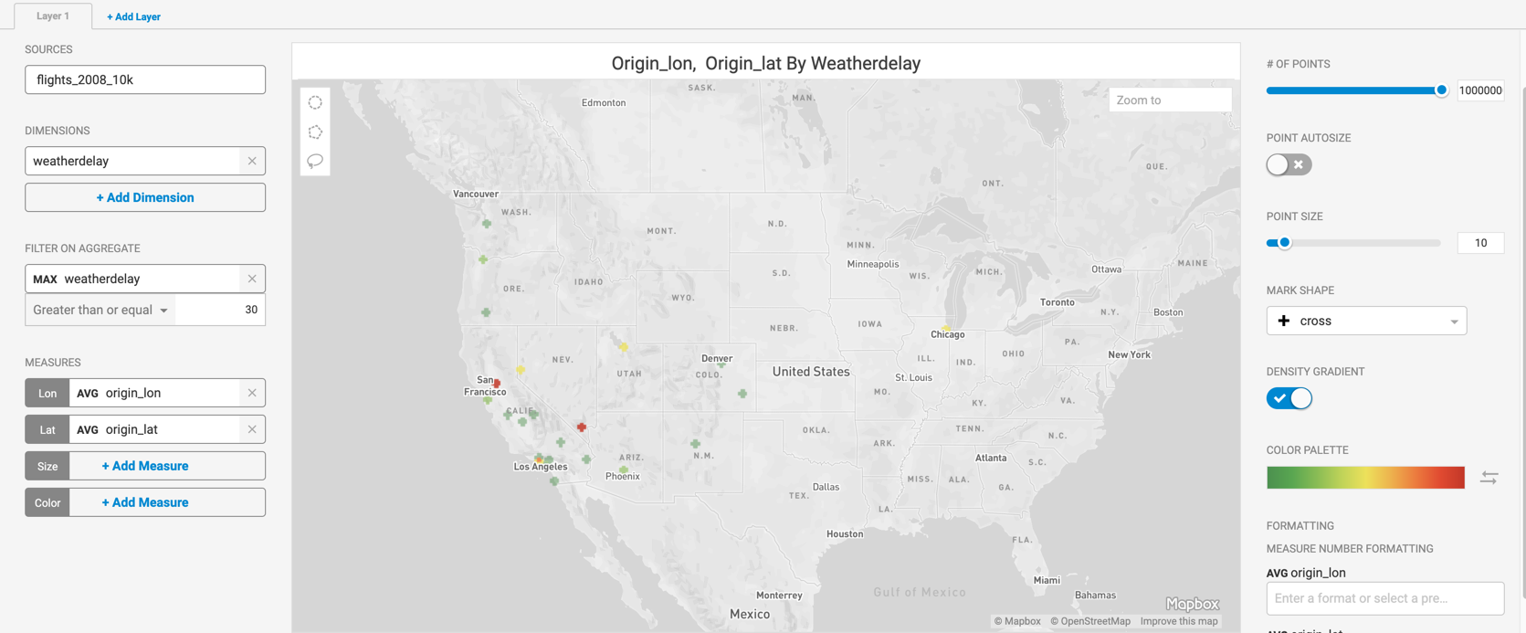 For example, this Pointmap shows the origin points of flights that experienced a weather delay.