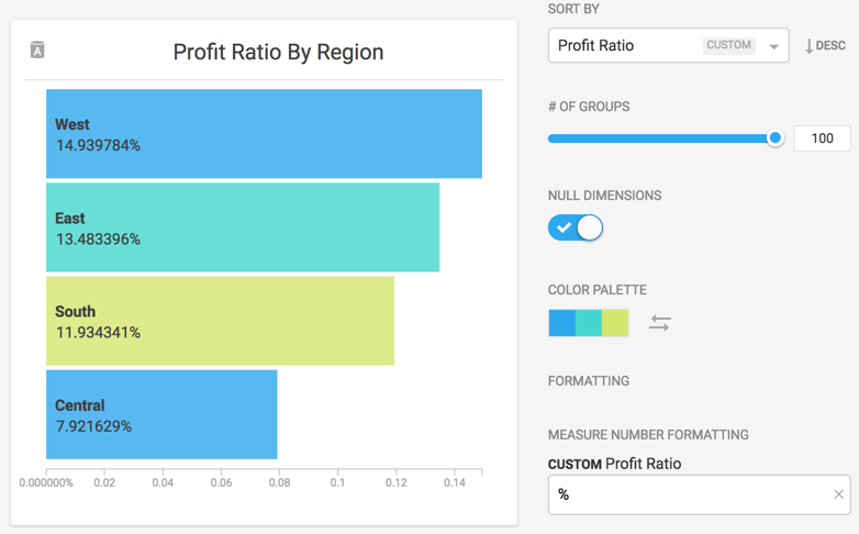 A query can have more than one dimension. For example, the number of cars sold by car manufacturer, by state. When a chart has multiple dimensions, the dimensions are separated by forward slashes (/). For example, the car manufacturer by state would display “Chevrolet / California.” Table Charts display multiple dimensions in separate table columns. You can change the order of dimensions by dragging and dropping the dimensions.