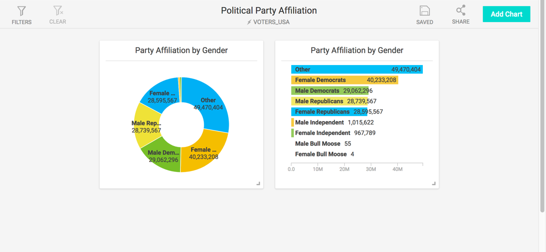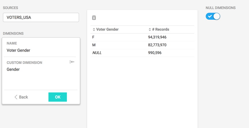For example, looking at a dataset of voters from the 2016 election, you might want to do some demographic analysis by gender. You can build your BY clause by adding the Gender column name. This is no different from setting the dimension to Gender, but it has the bonus side effect of changing the title of the column in your chart.
