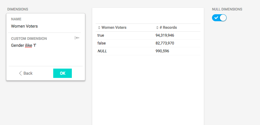 You might want to express the results as how many voters identified themselves as female. The custom SQL clause is 'f'. The Alias is Women Voters. The information is presented as true if the gender is female, or false if the gender is not.