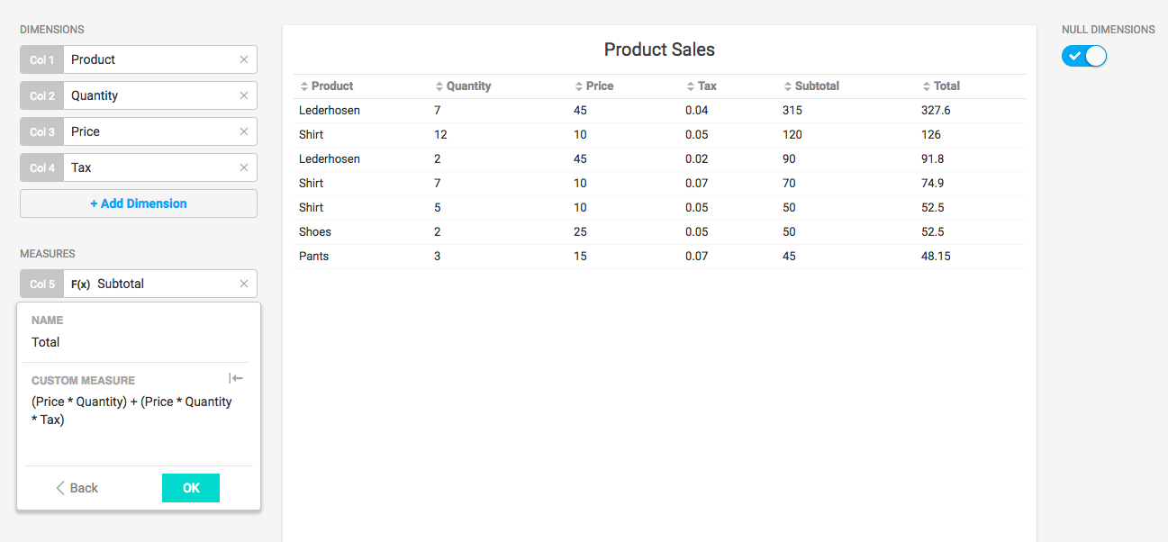 For example, if you have a table with Price, Quantity, and Tax columns, you can compute the Subtotal using the custom SQL clause (Quantity * Price) + (Quantity * Price * Tax).