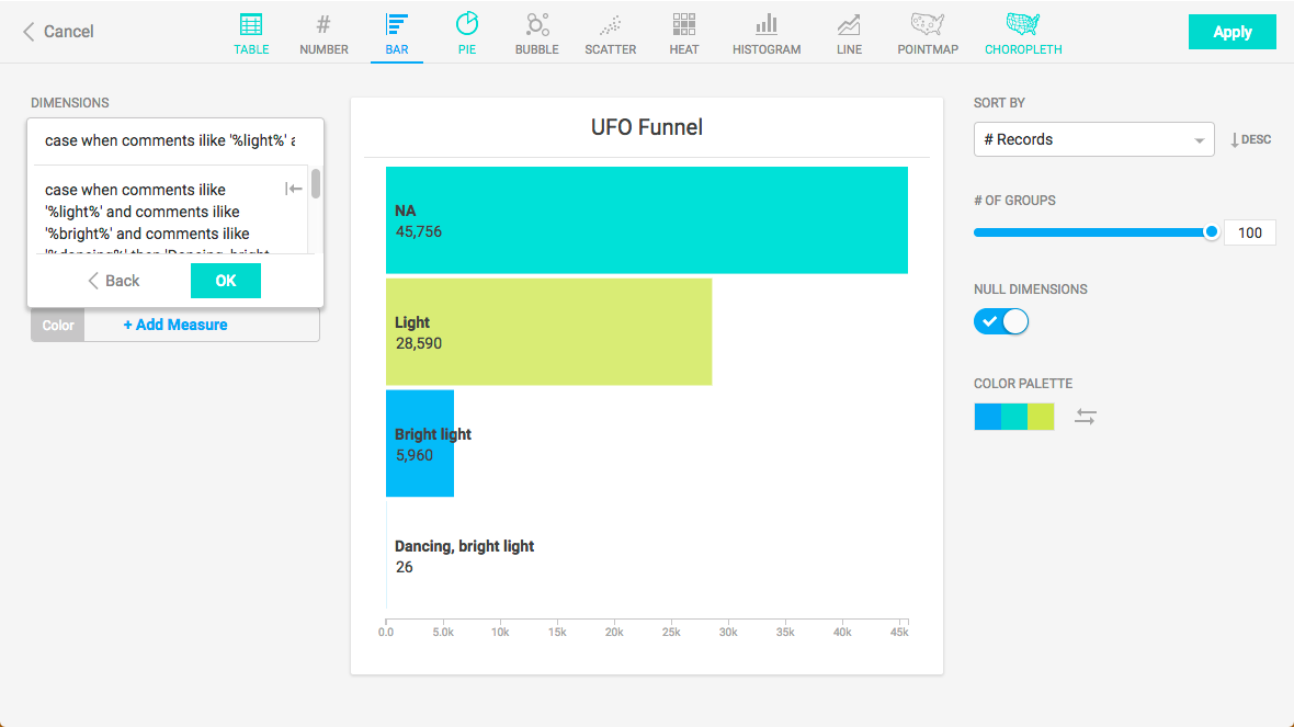 You can also use the case statement to create a funnel that aggregates data at an increasing level of specificity. For example, this SQL clause creates a chart that shows the number of UFO sightings based on an accumulation of common factors.