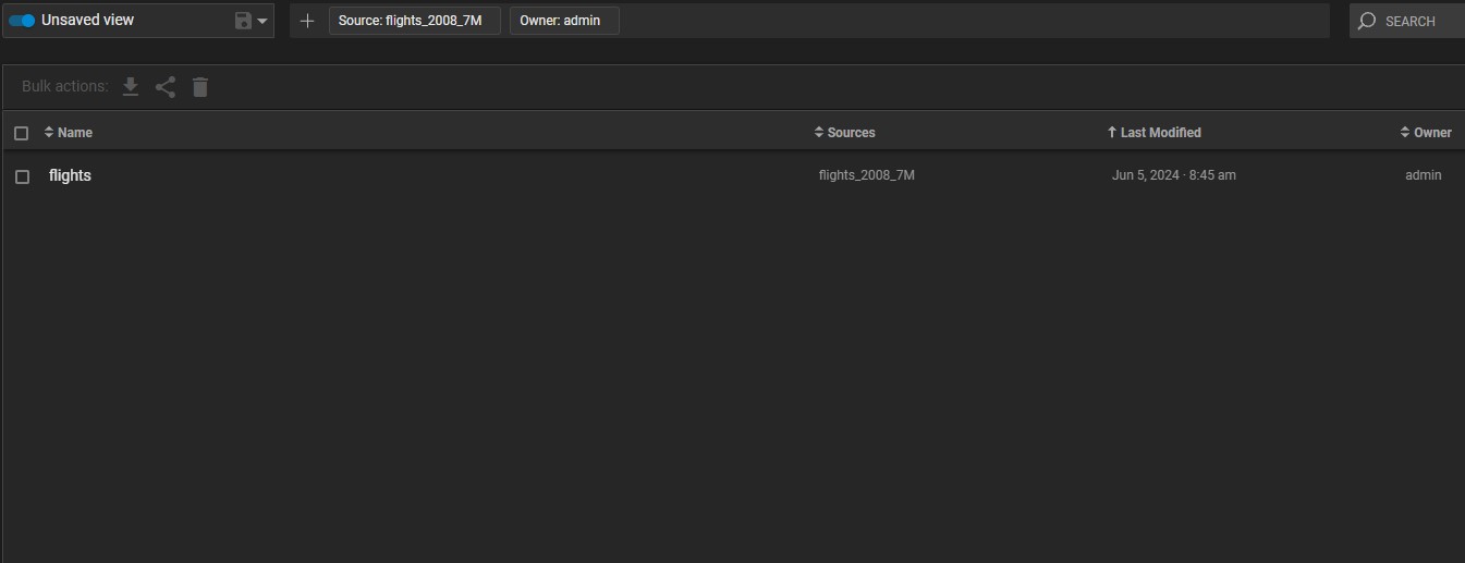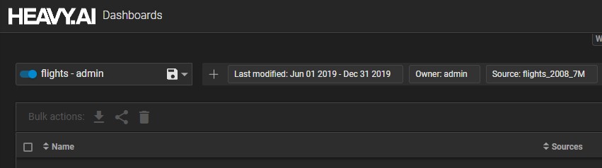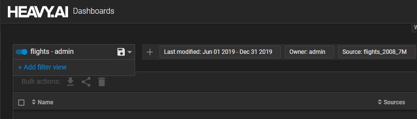 Use one or more filters to define the view. For example, that following view shows dashboards with source flights_2008_7M and owner admin: