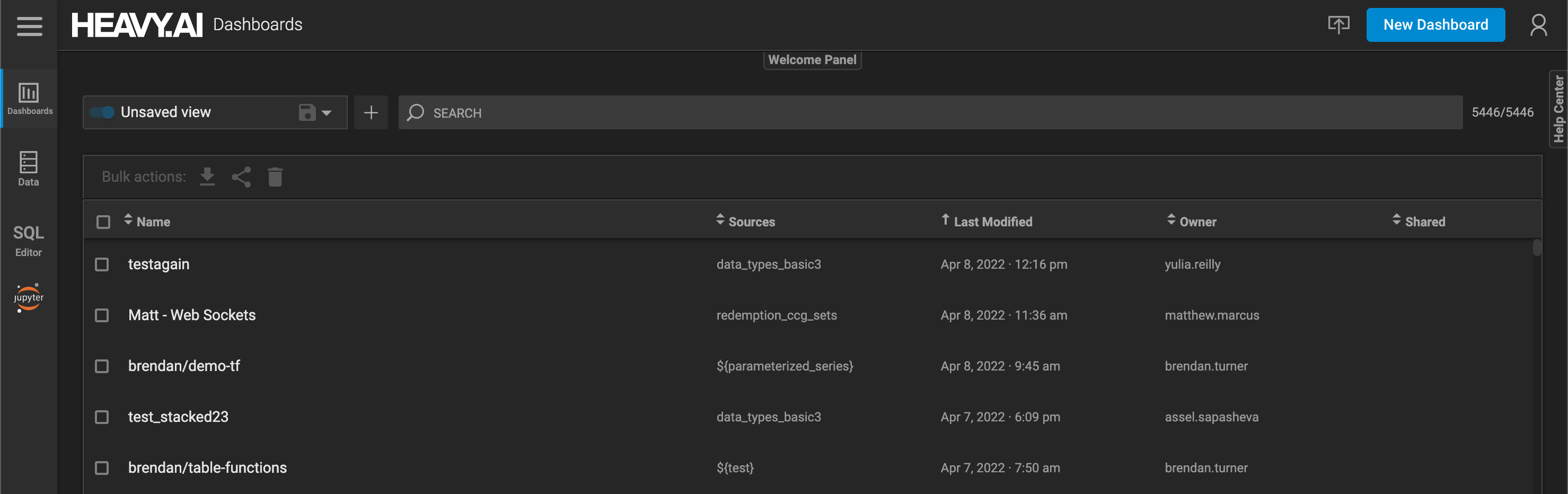 Connect to HeavyImmerse by pointing a web browser to port 6273 on your HeavyDB server. When you launch Immerse, the landing page shows a list of saved dashboards. The number to the right of the Search box shows the number of dashboards displayed (left side of the slash) and the number of total dashboards (right side of the slash). Because no filters are applied here, these numbers are the same (5446).