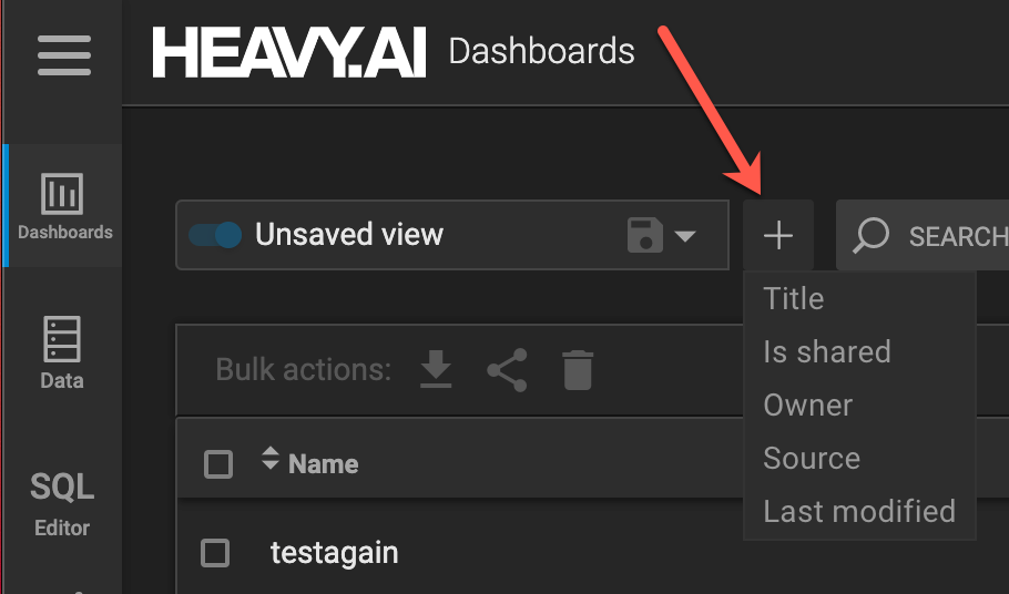 - Filter dashboards by name, source, last modified date, owner, and shared status.