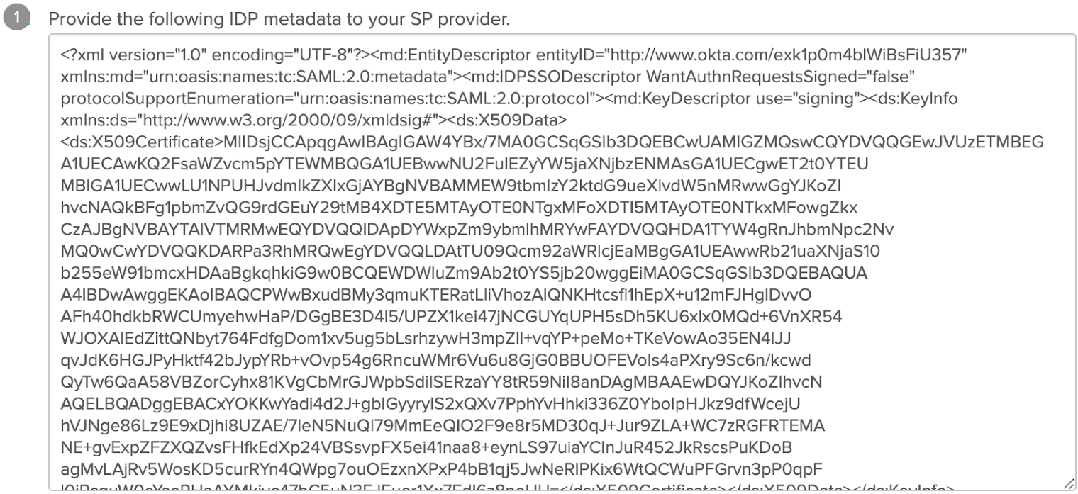 2) On the How to Configure SAML 2.0 for HEAVY.AI Application page, scroll to the bottom, copy the XML fragment in the Provide the following IDP metadata to your SP provider box, and save it as a raw text file called idp.xml.