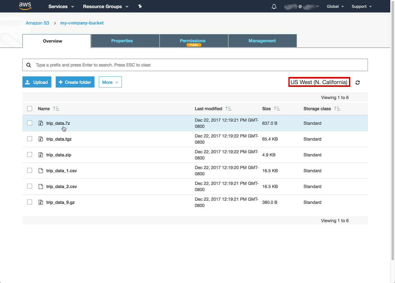 Click the file you want to import. To load your S3 file to HEAVY.AI using the steps for S3 Region | Bucket | Path, below, click Copy path to copy to your clipboard the path to your file within your S3 bucket. Alternatively, you can copy the link to your file. The Link in this example is https://s3-us-west-1.amazonaws.com/my-company-bucket/trip_data.7z.