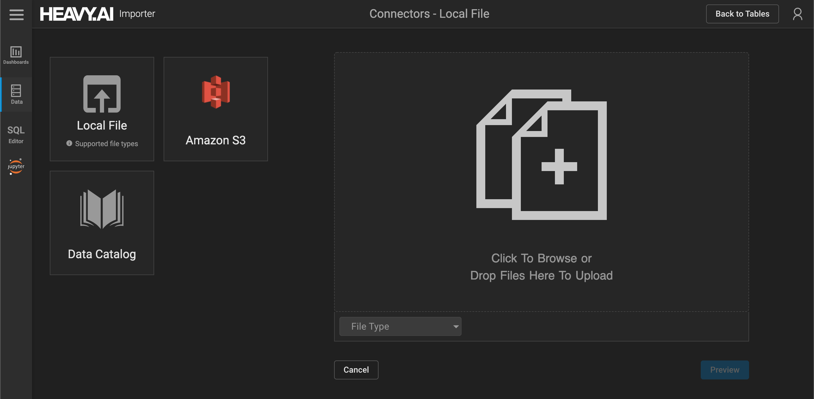 You can import data to HeavyDB using the Immerse import wizard. You can upload data from a local delimited file, from an Amazon S3 data source, or from the Data Catalog.
