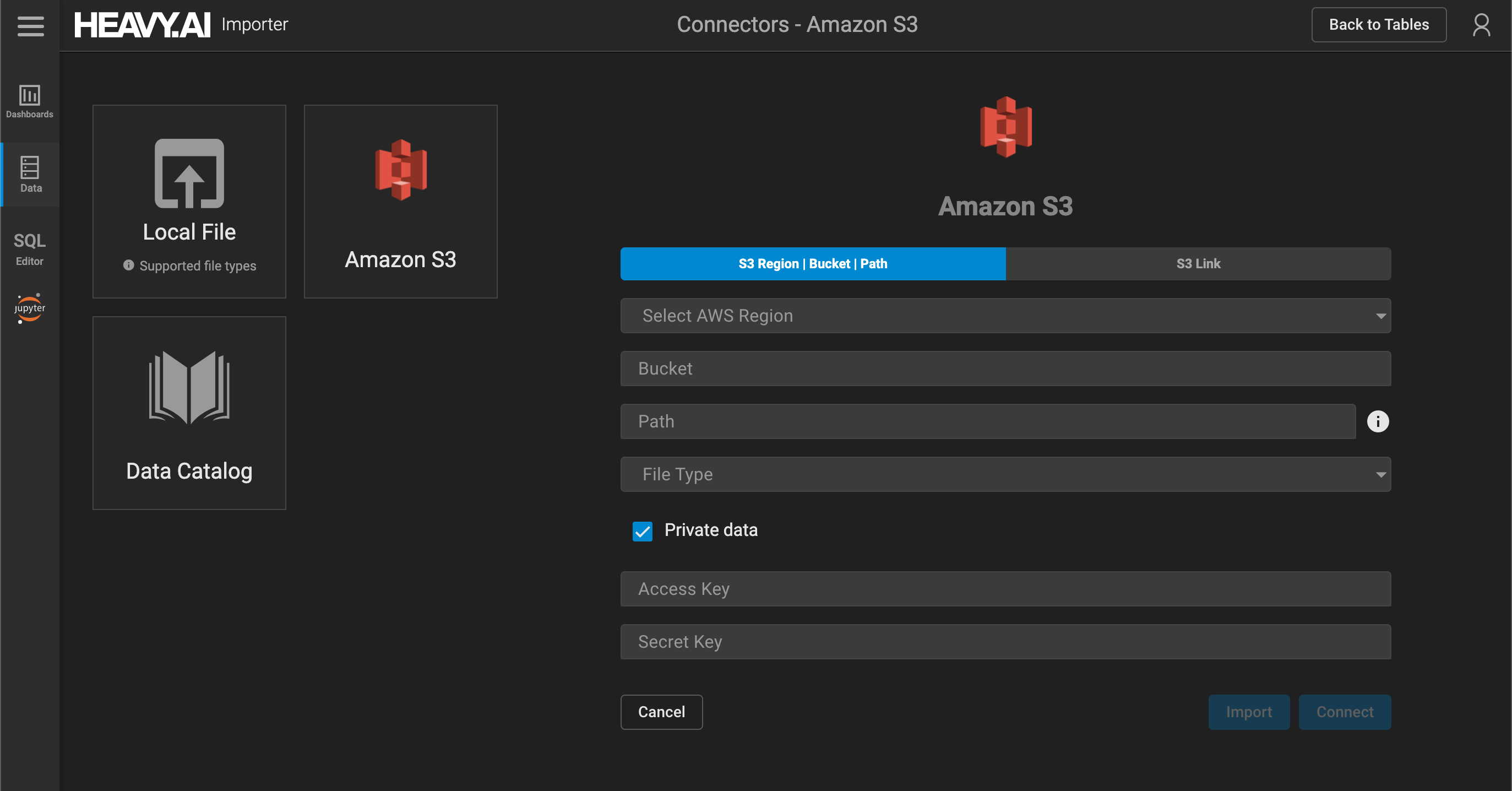 - If importing private data, your Access Key and Secret Key for your personal IAM account in S3.