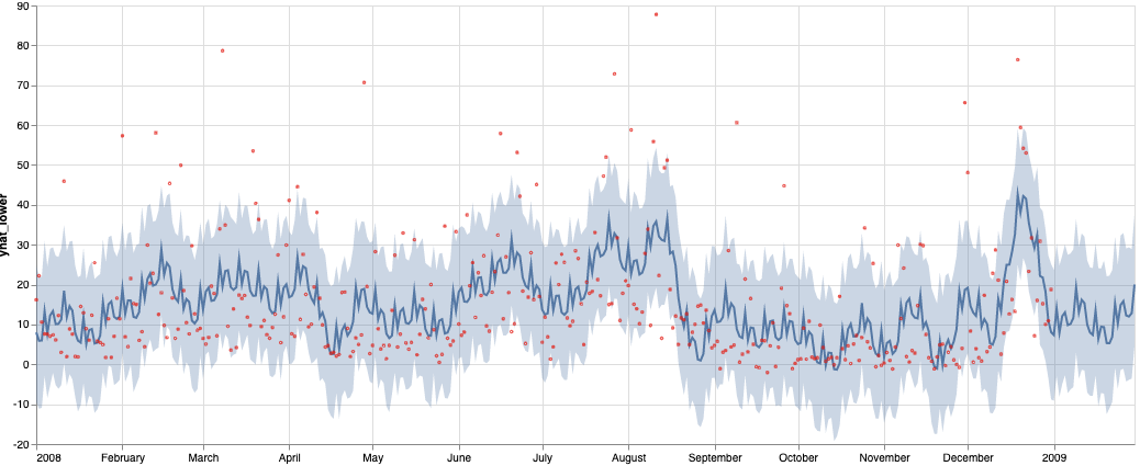 Finally, to see show how Ibis can support multiple backends, including pandas as an ibis backend, build an Altair chart for the forecast output dataframe to see what the forecast looks like. Use Altair’s compound chart functionality to overlay the original Ibis expression for the past data, with the error bounds and the forecast trend line.