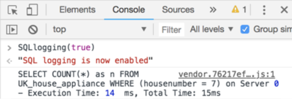 Using Chrome’s Developer Tools, you can interact with data in Immerse to see SQL and response times from OmniSciDB. The syntax is SQLlogging(true), entered under the console tab inline, as shown below.