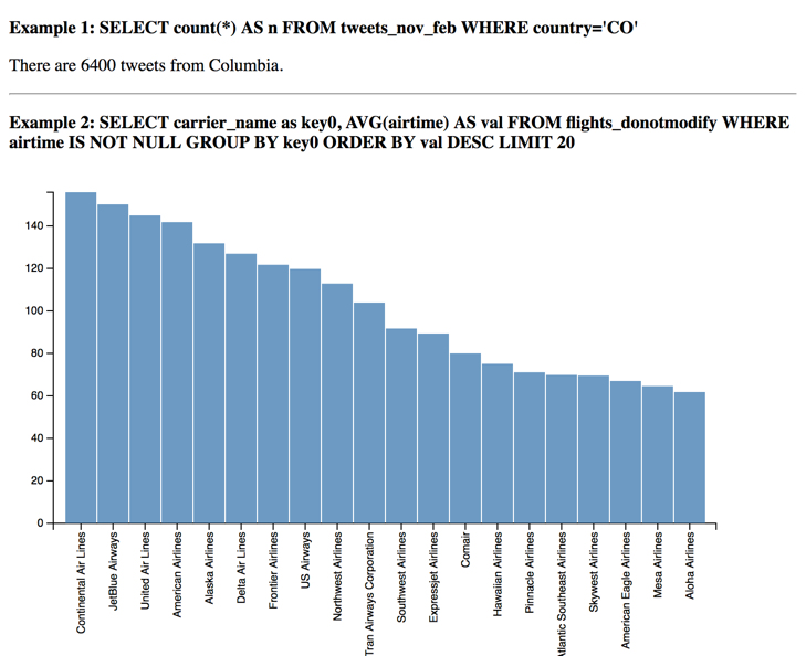 Open mapd-connector/examples/browser.html in a web browser to connect to a sample HEAVY.AI server instance and display information from the sample database. You can open mapd-connector/examples/browser.js in a text editor and follow along as the following sections describe how the script connects, retrieves, and displays data from the HEAVY.AI server.
