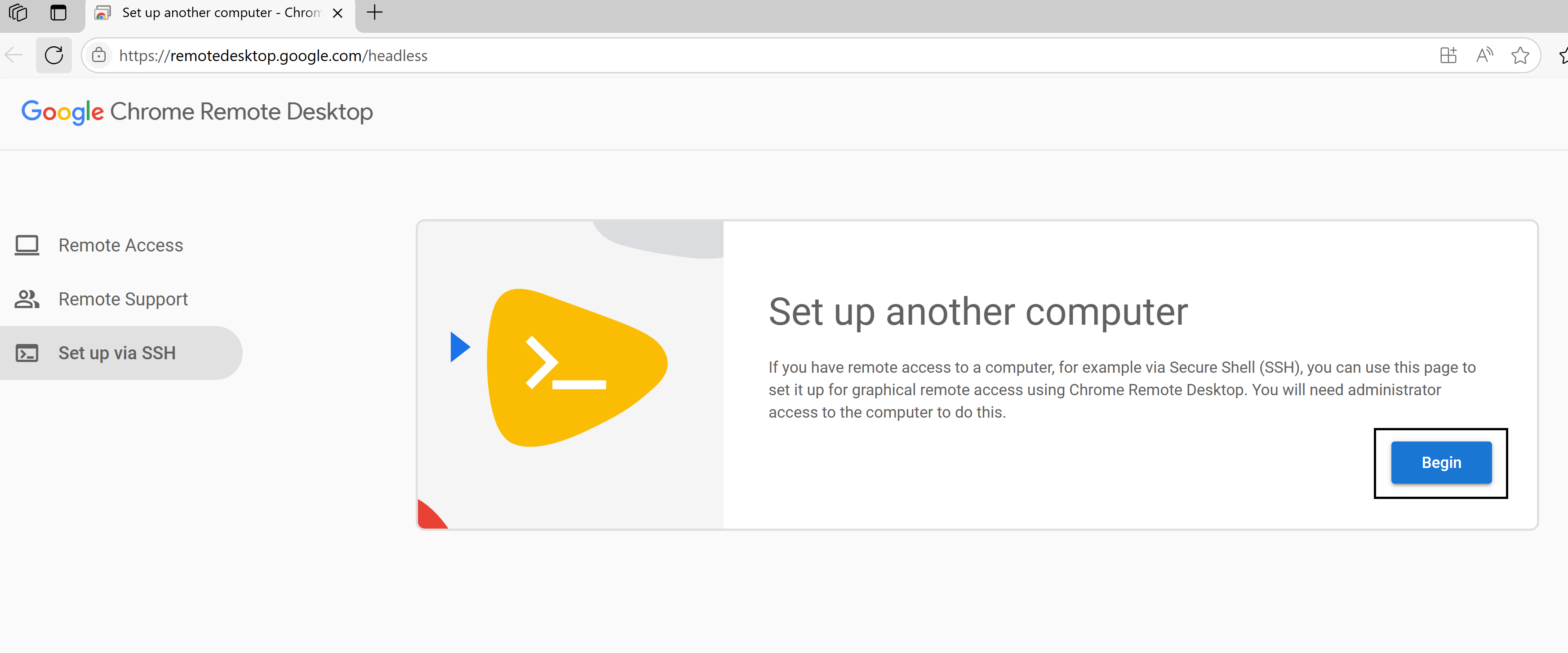 Under the Set up via SSH section, click Begin, then Next, and then Authorize.