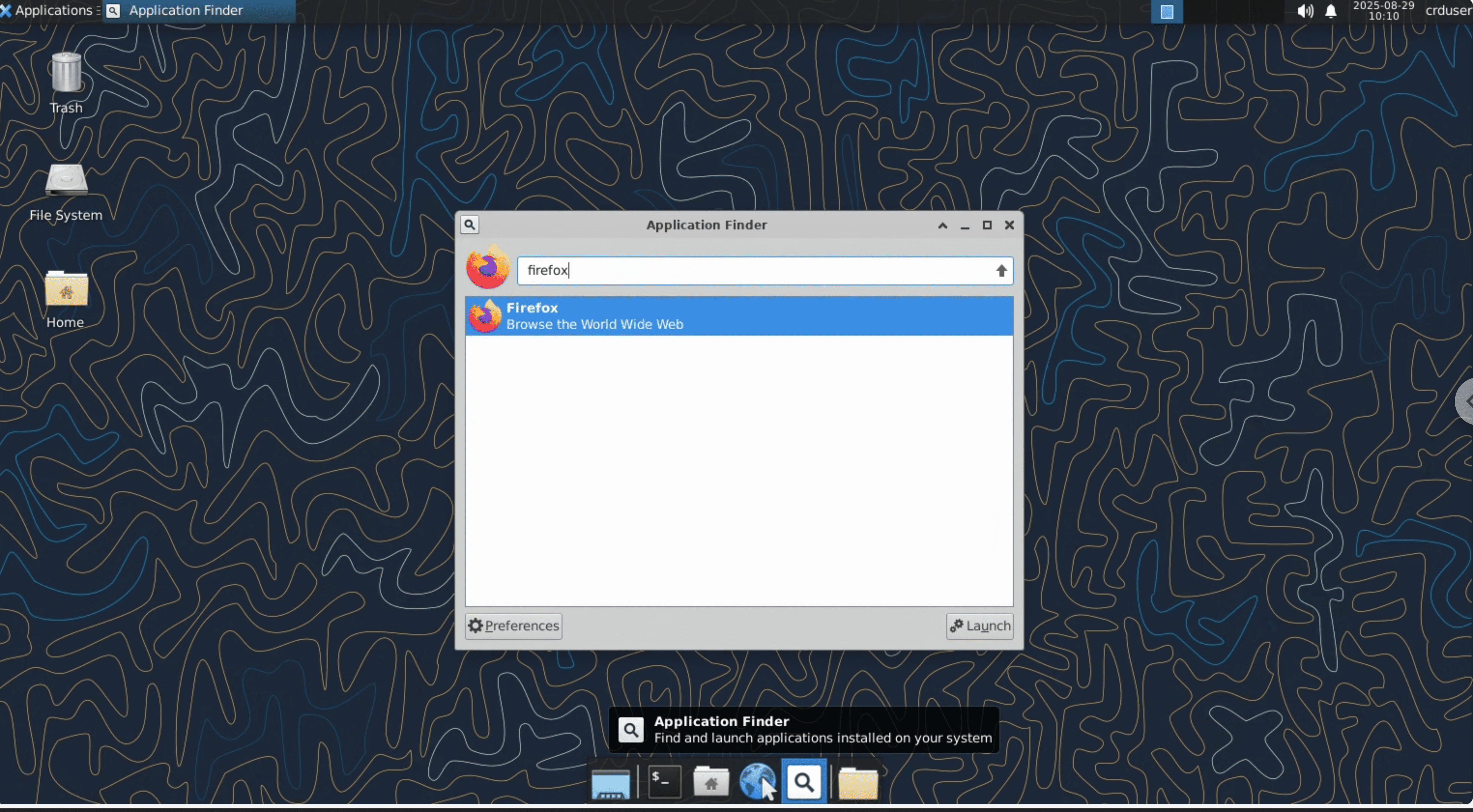 After connecting to Chrome Remote Desktop, click Application Finder in the dock at the bottom of the screen, search for Firefox, and click the icon to open it.
