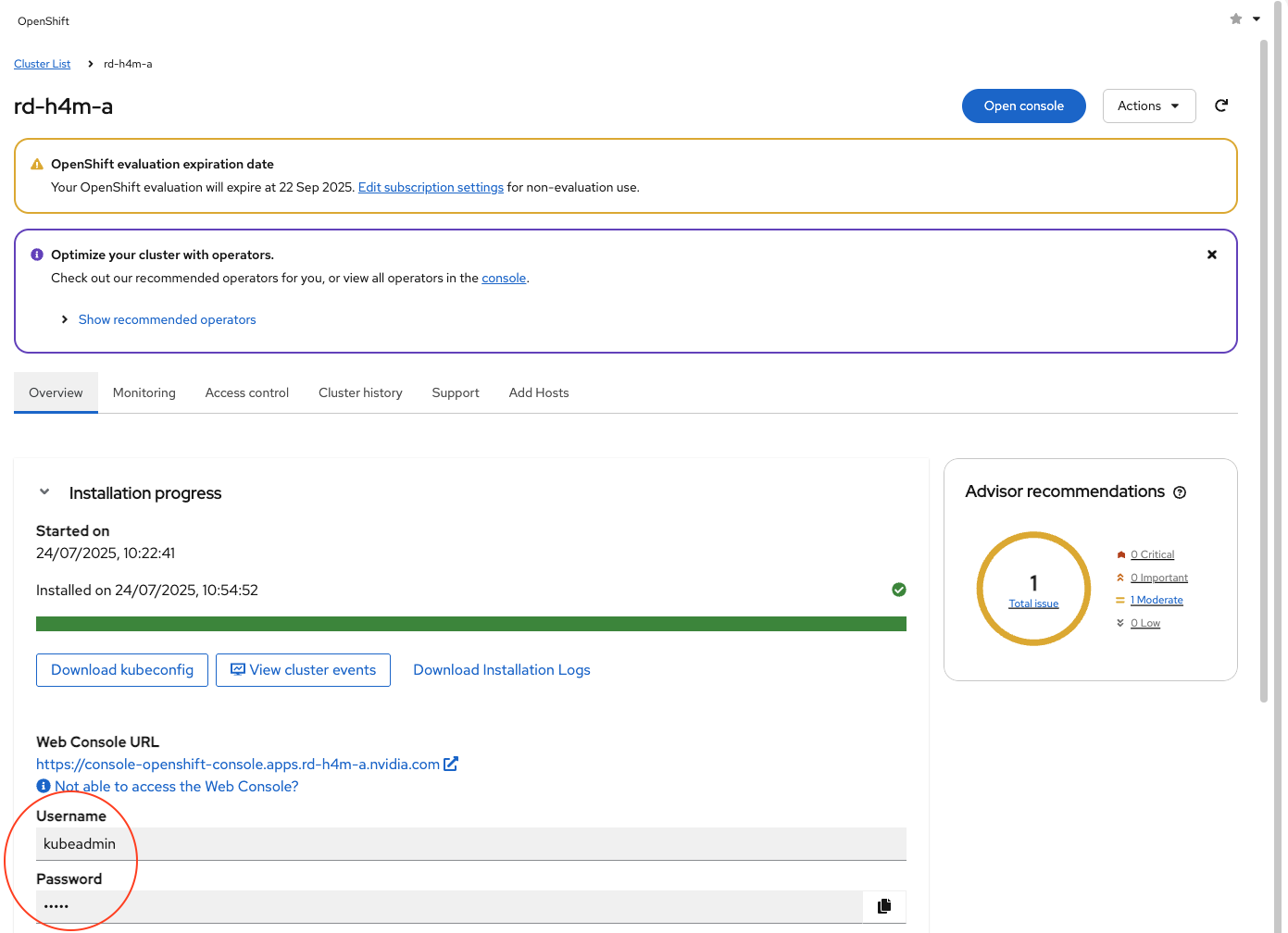 End of Cluster Installation: The console URL and password are printed to the terminal after a successful cluster installation. Refer to end of installation output for more details.