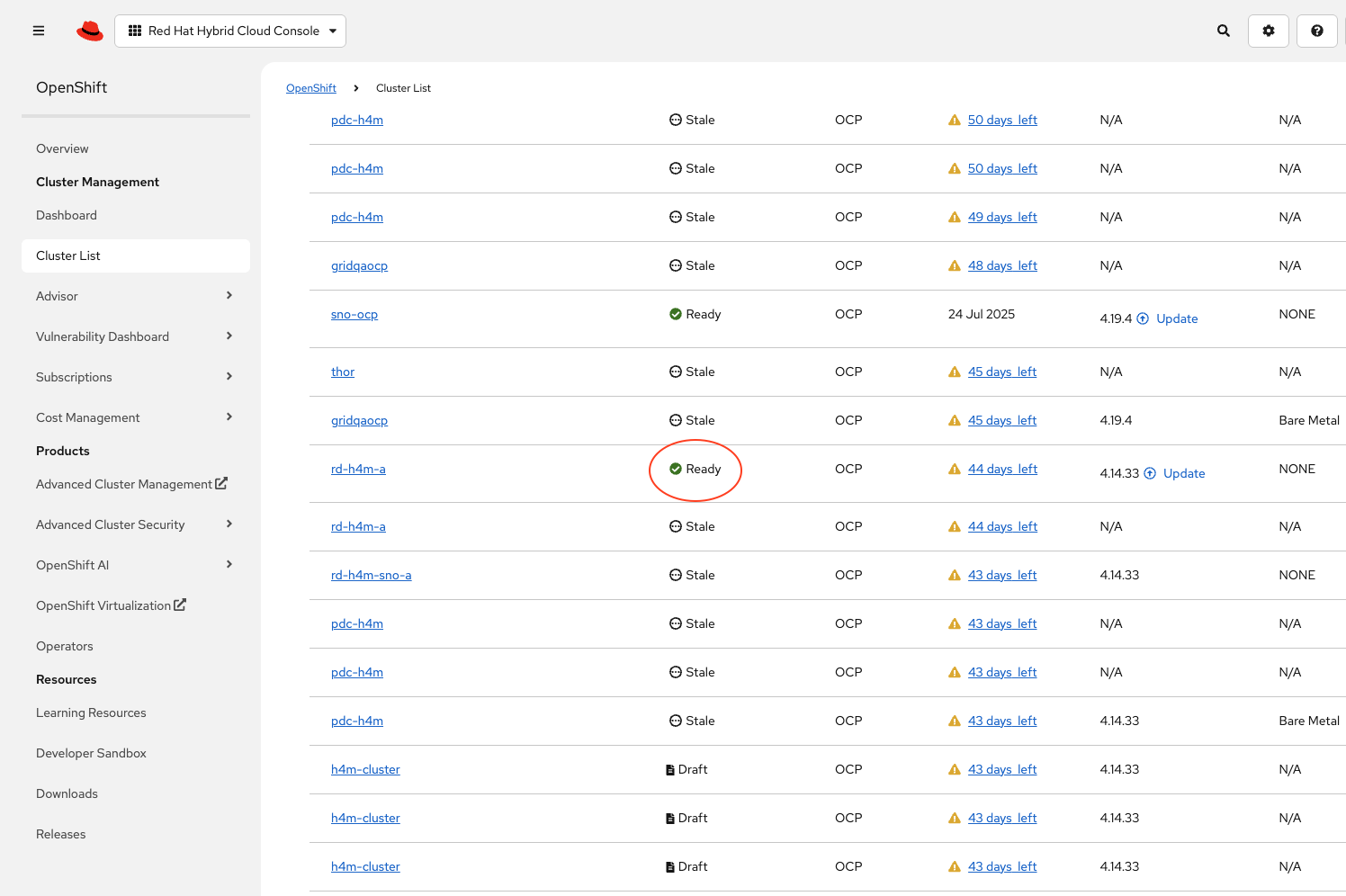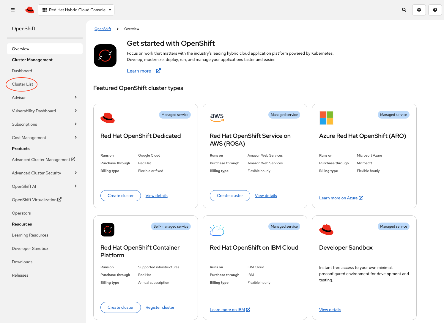 Log in to the Red Hat console and click Cluster List.