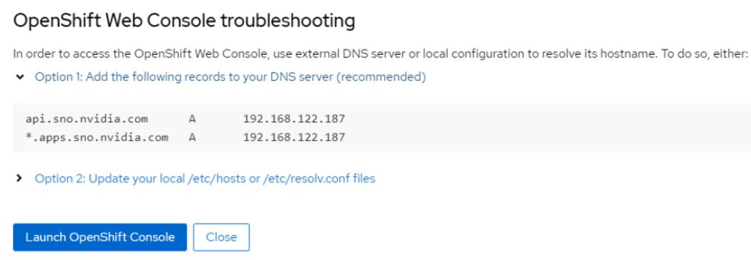 If you are not able to access the web console, refer to IP Addresses and DNS Records or click Not able to access the Web Console to get a troubleshooting dialog box with information to access the cluster.