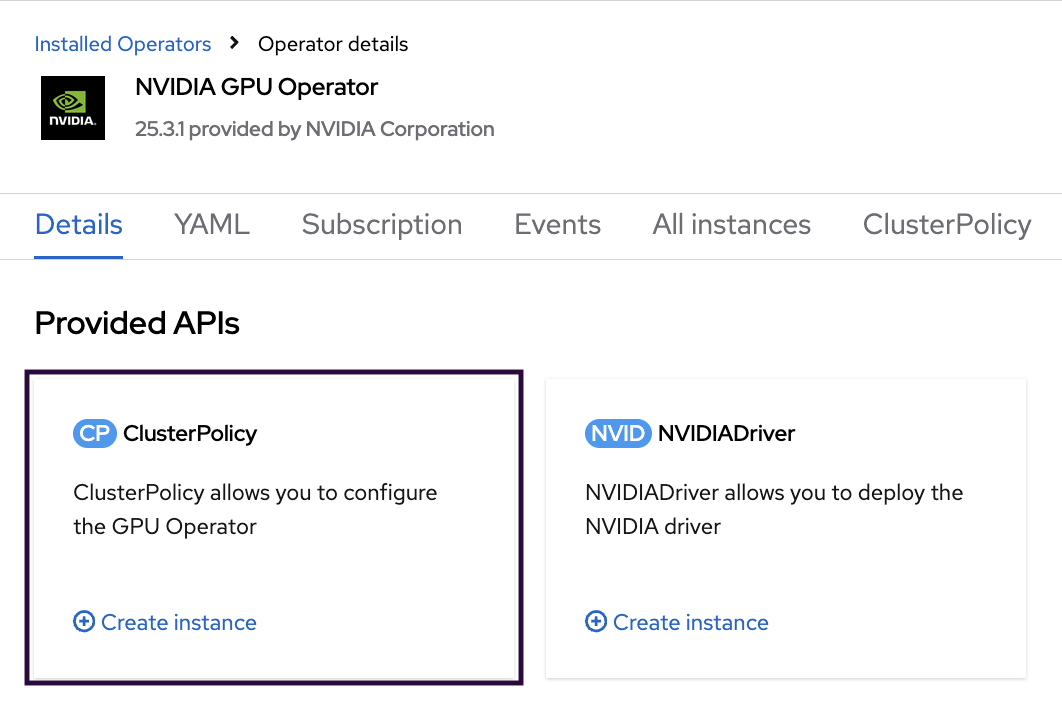 On the NVIDIA GPU Operator details screen, click Create instance in the ClusterPolicy section.