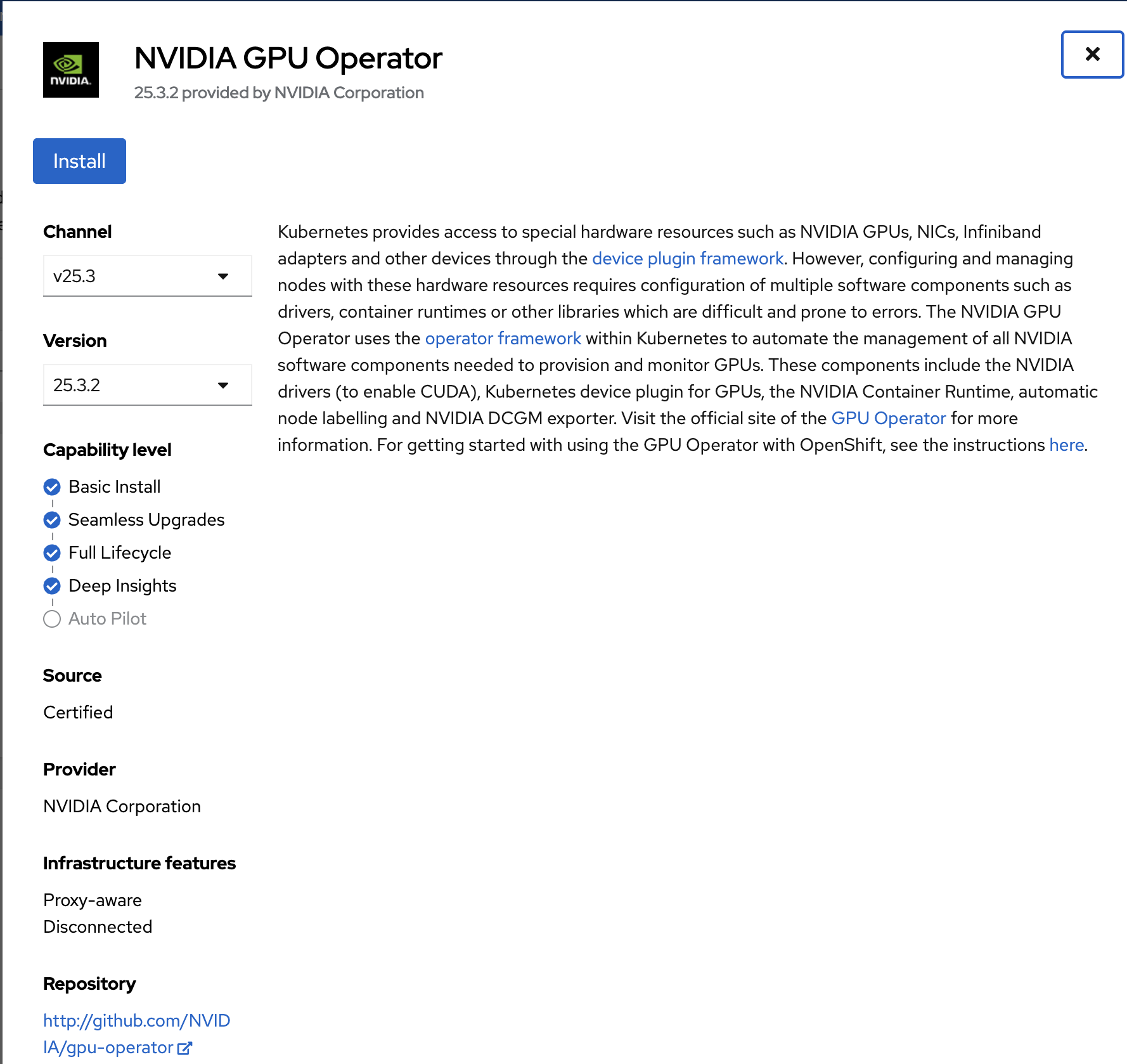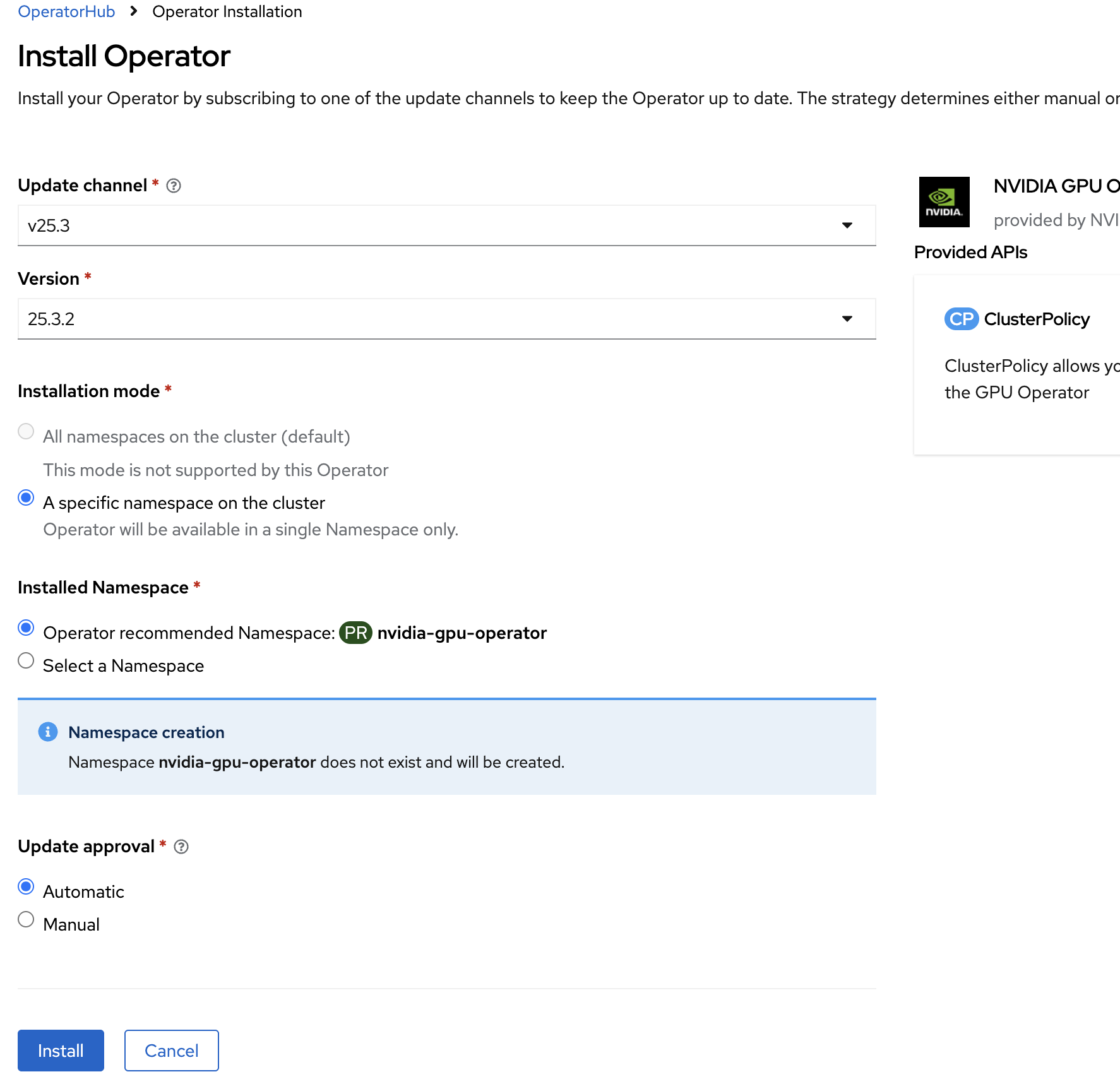 Select NVIDIA GPU Operator and click Install in the next window.