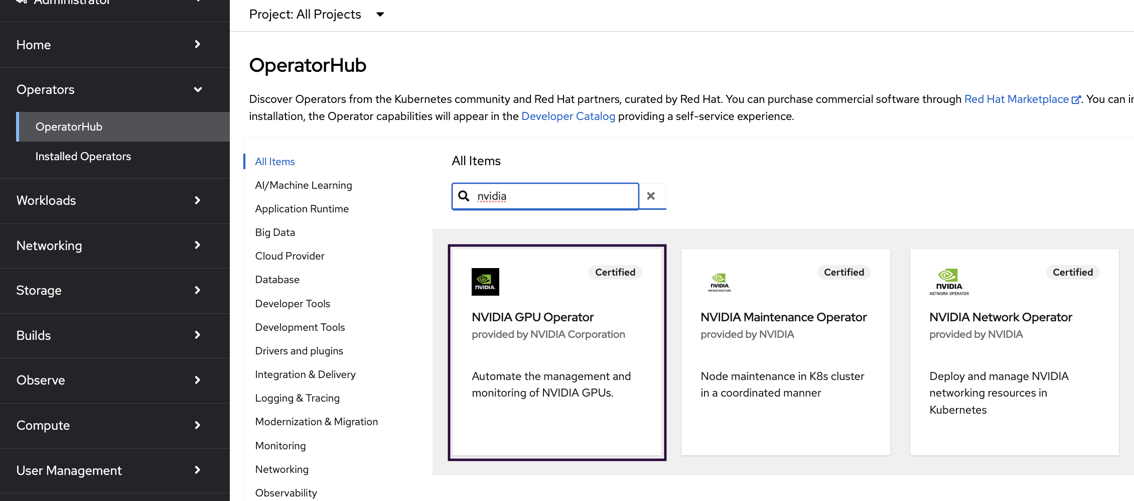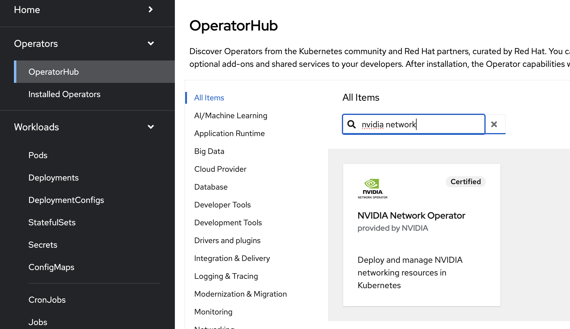 Use the search bar to search for NVIDIA. Select NVIDIA Network Operator.