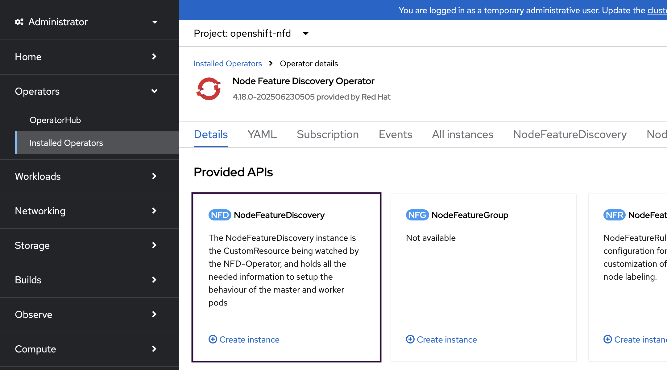 Click Node Feature Discovery Operator. Under the Provided APIs section, click Create instance for NodeFeatureDiscovery. In the subsequent screen, click the Create button.